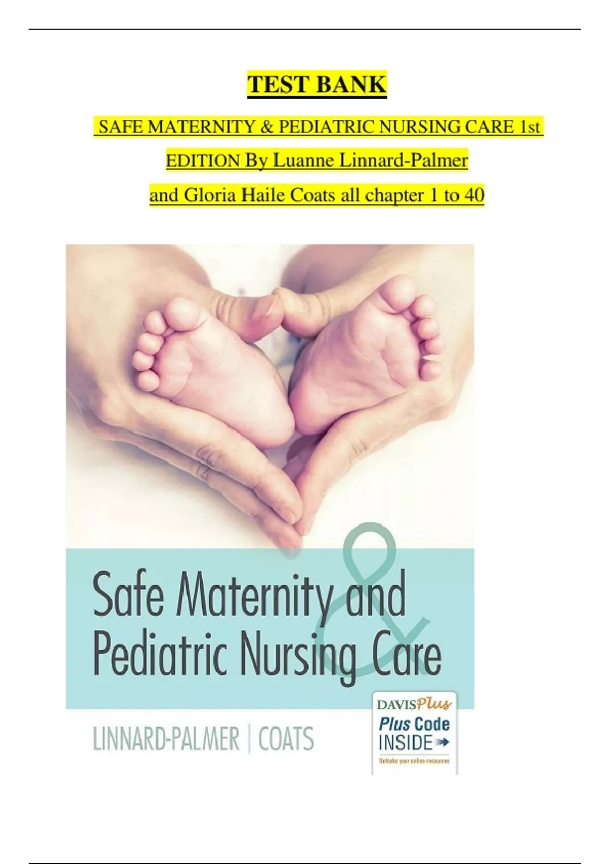 SAFE MATERNITY & PEDIATRIC NURSING CARE 1st EDITION TEST BANK By Luanne Linnard-Palmer and Gloria Haile Coats ISBN- 978-0803624948 Latest Verified Review 2024 Practice Questions and Answers for Exam Preparation, 100% Correct with Explanations, Highly Recommended, Download to Score A+ SAFE MATERNITY & PEDIATRIC NURSING CARE 1st EDITION TEST BANK By Luanne Linnard-Palmer and Gloria Haile Coats Contents: I. Introduction of Maternity and Pediatric Nursing Chapter 1. Healthy People 2020 and Initiatives for Healthy Families II. Pregnancy and The Family Chapter 2. Introduction to Maternity Nursing Chapter 3. Human Reproduction and Fetal Development Chapter 4. Physical and Psychological Changes of Pregnancy Chapter 5. Antepartal Nursing Assessment Chapter 6. Nursing Care During Pregnancy Chapter 7. Nursing Care of Complications During Pregnancy III. Birth and The Family Chapter 8. Process and Stages of Labor and Birth Chapter 9. Nursing Assessment During Labor Chapter 10. Nursing Care During Labor Chapter 11. Nursing Care of the Woman with Complications During Labor and Birth Chapter 12. Birth-Related Procedures IV. Postpartum Period and The Family Chapter 13. Physiologic and Behavioral Adaptations During the Postpartum Period Chapter 14. Assessment and Care of the Family After Birth V. The Newborn Chapter 15. Physiologic and Behavioral Adaptations of the Newborn Chapter 16. Assessment and Care of the Newborn Chapter 17. Newborn Nutrition Chapter 18. Newborn at Risk; Conditions Present at Birth Chapter 19. Newborn at Risk; Birth-Related Stressors VI. Growth and Development Chapter 20. Introduction to Pediatric Nursing Chapter 21. Health Promotion of the Infant Chapter 22. Health Promotion of the Toddler Chapter 23. Health Promotion of the Preschooler Chapter 24. Health Promotion of the School-Age Child Chapter 25. Health Promotion of the Adolescent VII. Pediatric Concerns and Considerations Chapter 26. The Hospitalized Child Chapter 27. Acutely Ill Children and Their Needs Chapter 28. The Abused Child VIII. Deviations in Pediatric Health Chapter 29. Child with A Neurologic Condition Chapter 30. Child with A Sensory Impairment Chapter 31. Child with A Mental Health Condition Chapter 32. Child with A Respiratory Condition Chapter 33. Child with A Cardiac Condition Chapter 34. Child with A Metabolic Condition Chapter 35. Child with A Musculoskeletal Condition Chapter 36. Child with A Gastrointestinal Condition Chapter 37. Child with A Genitourinary Condition Chapter 38. Child with A Skin Condition Chapter 39. Child with A Communicable Disease Chapter 40. Child with An Oncologic or Hematologic Condition