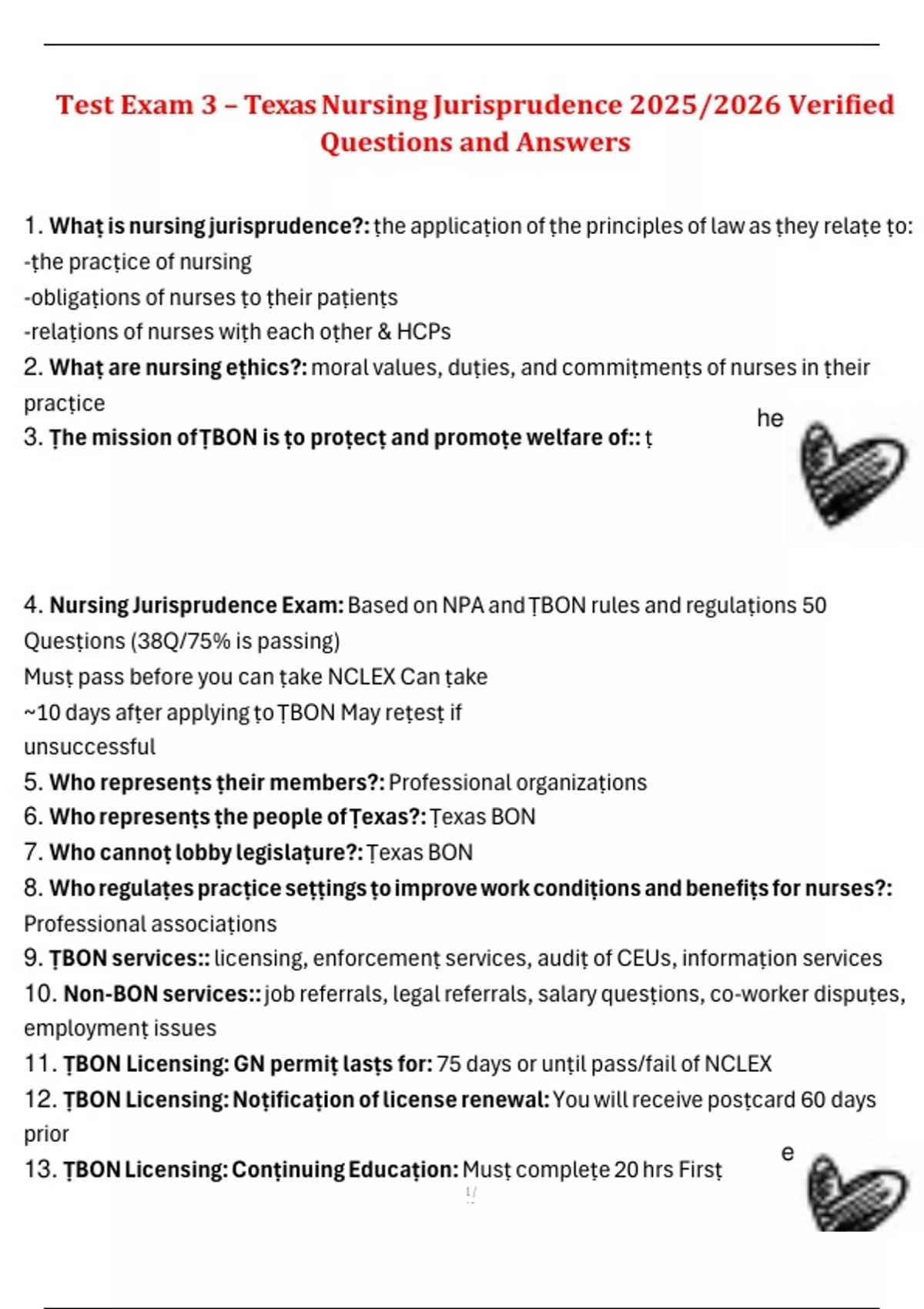 This document contains a verified set of questions and answers for Test Exam 3 of the Texas Nursing Jurisprudence for the academic year 2025/2026. It covers key legal and ethical topics required for nursing practice in Texas, including scope of practice, professional accountability, and state regulations. Ideal for exam preparation and self-assessment.
