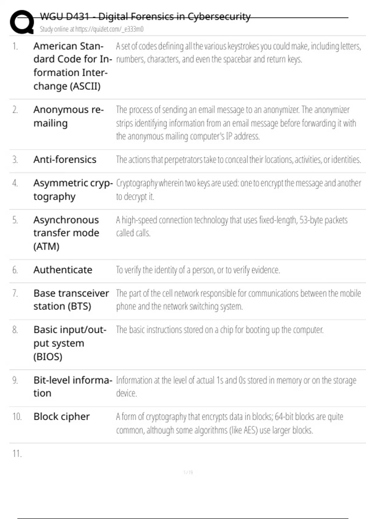 10. Block cipher A form of cryptography that encrypts data in blocks; 64-bit blocks are quite