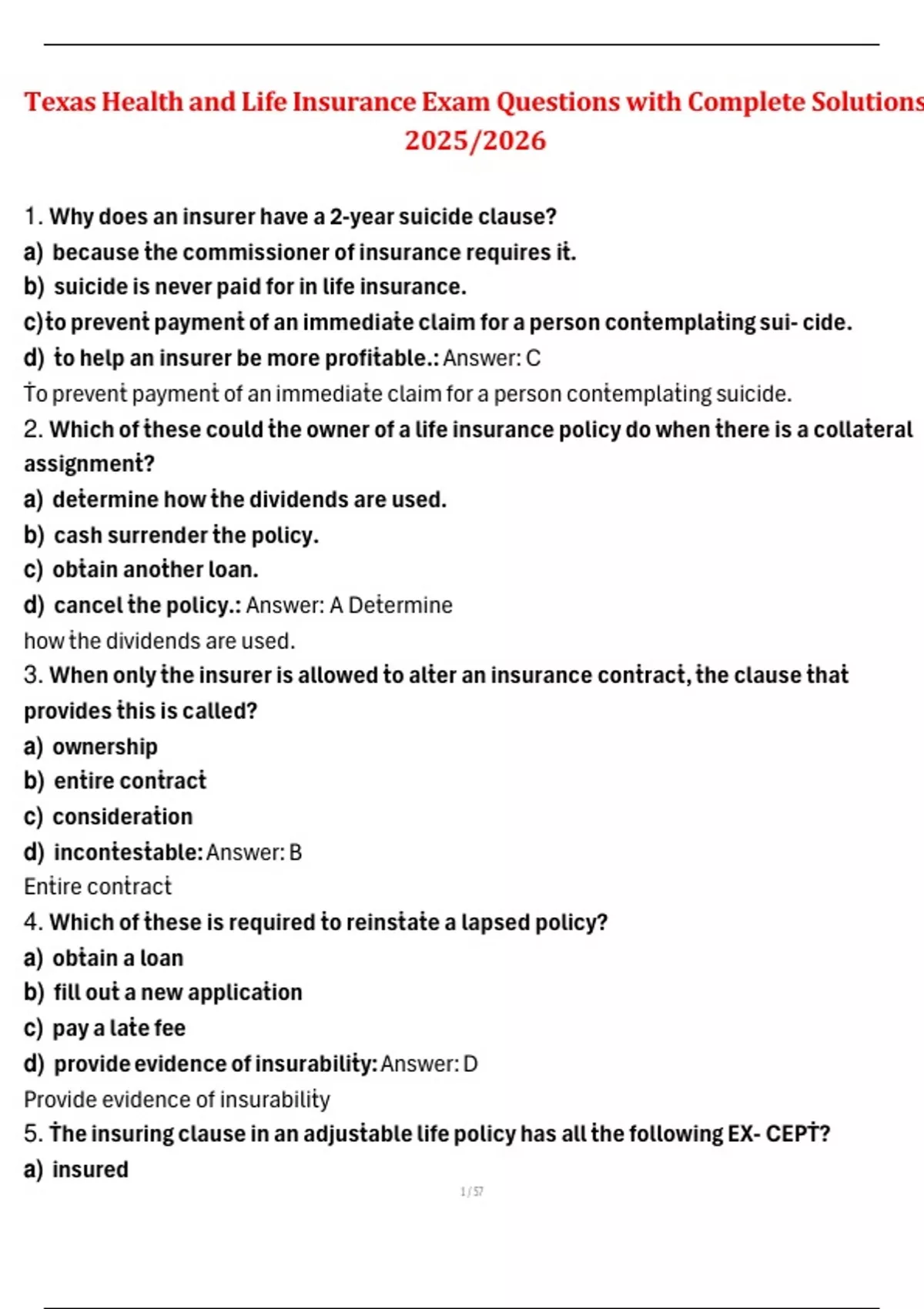 This document offers a thorough set of exam-style questions and complete solutions tailored to the 2025/2026 Texas Health and Life Insurance licensing exam. It covers all major content areas, including life insurance policies, health insurance coverage, annuities, state-specific regulations, and ethical standards. The solutions are clearly explained to reinforce understanding, making this an ideal tool for both learning and review.
