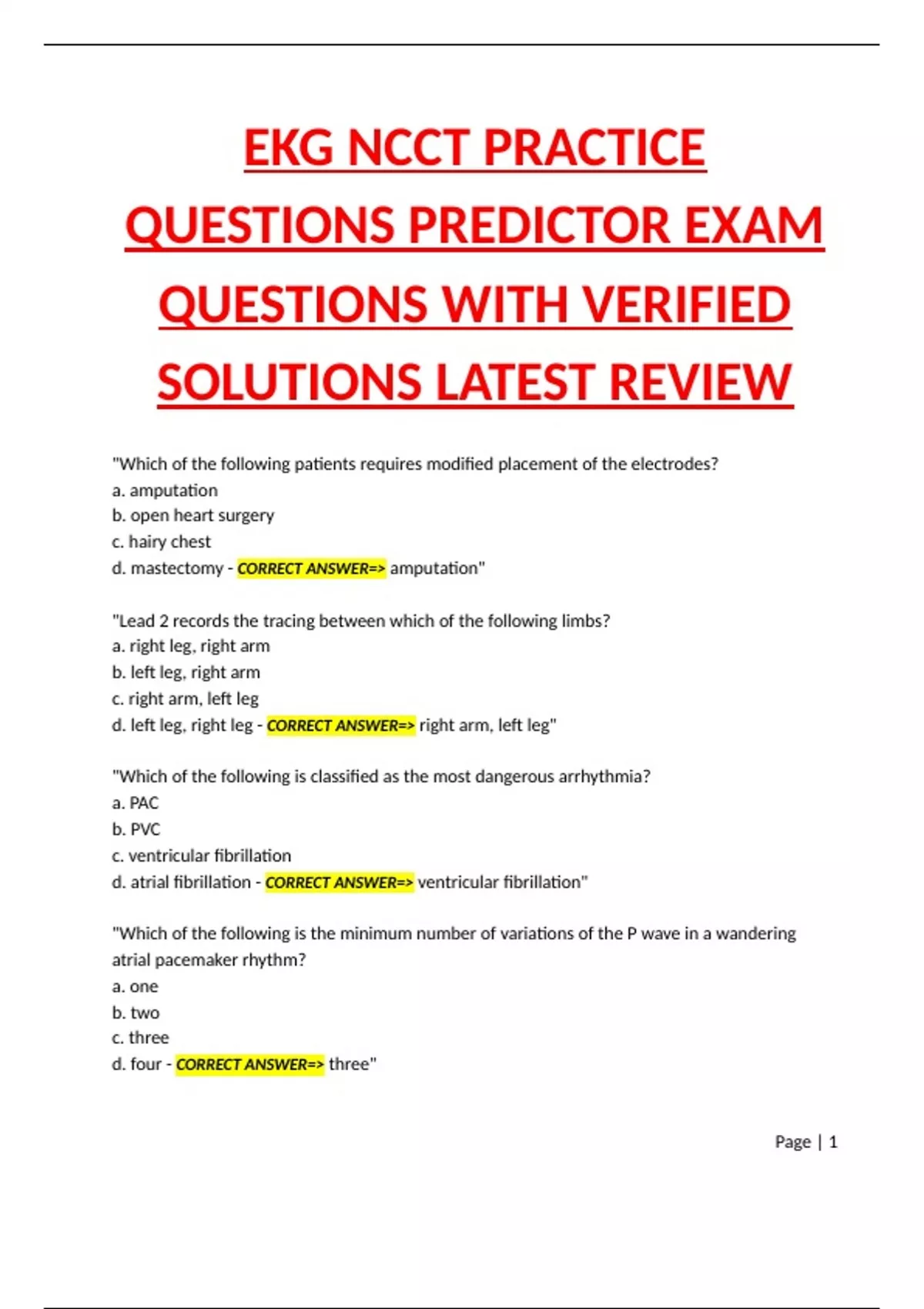 EKG NCCT PRACTICE QUESTIONS PREDICTOR EXAM QUESTIONS WITH VERIFIED SOLUTIONS LATEST REVIEW