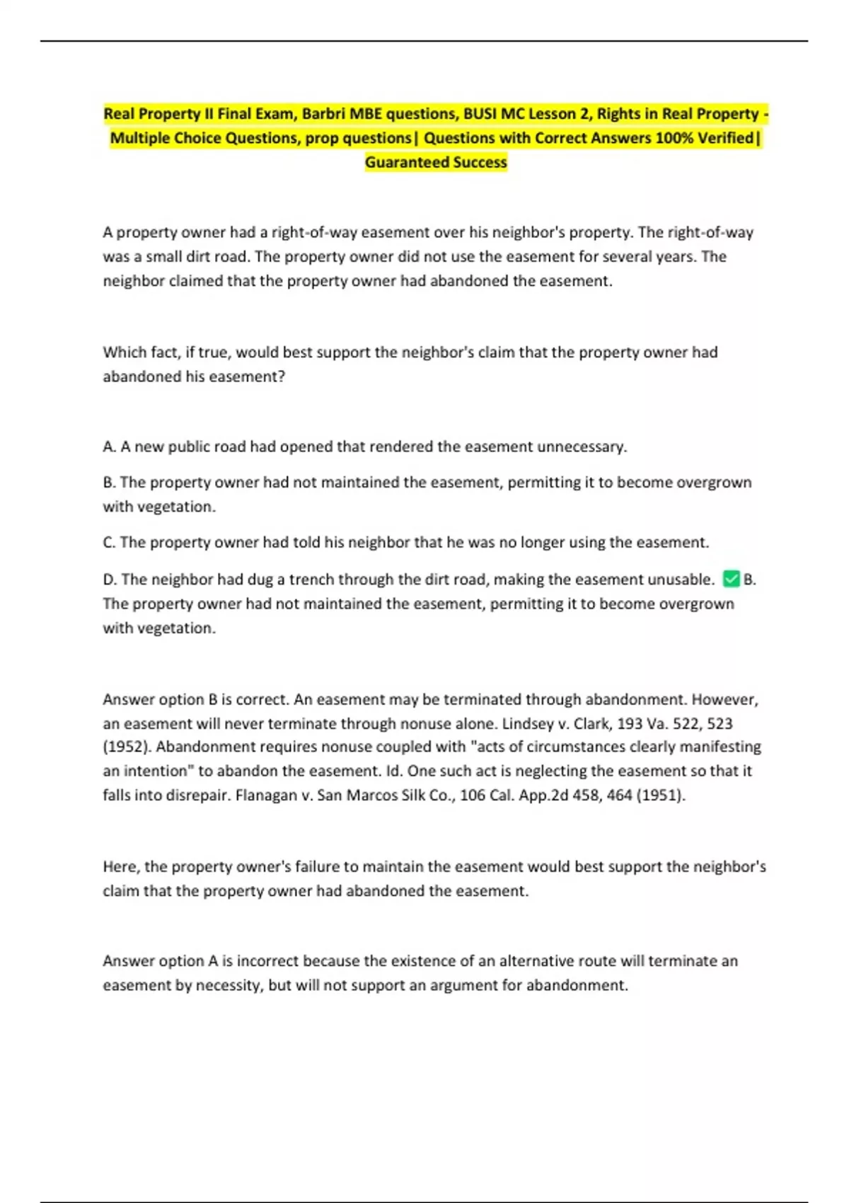 Answer option B is correct. Easements may be terminated several ways. One such manner of