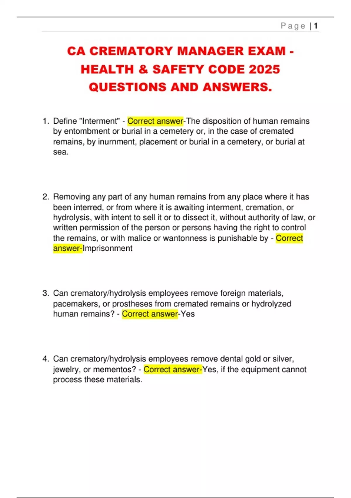 1. Define "Interment" - Correct answer-The disposition of human remains