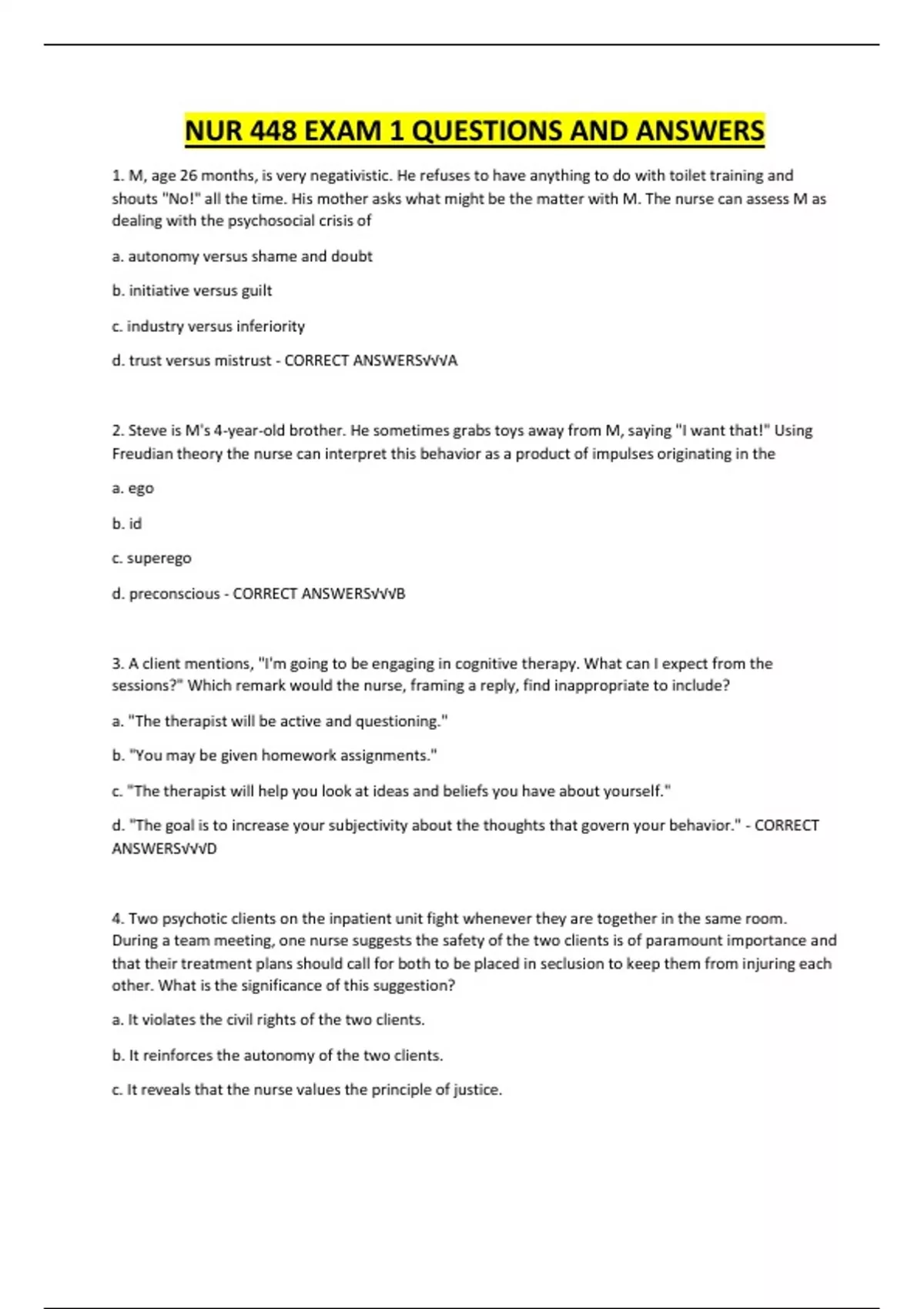 NUR 448 EXAM 1 QUESTIONS AND ANSWERS 1. M, age 26 months, is very negativistic. He refuses to have anything to do with toilet training and shouts "No!" all the time. His mother asks what might be the matter with M. The nurse can assess M as dealing with the psychosocial crisis of a. autonomy versus shame and doubt b. initiative versus guilt c. industry versus inferiority d. trust versus mistrust - CORRECT ANSWERS√√√A
