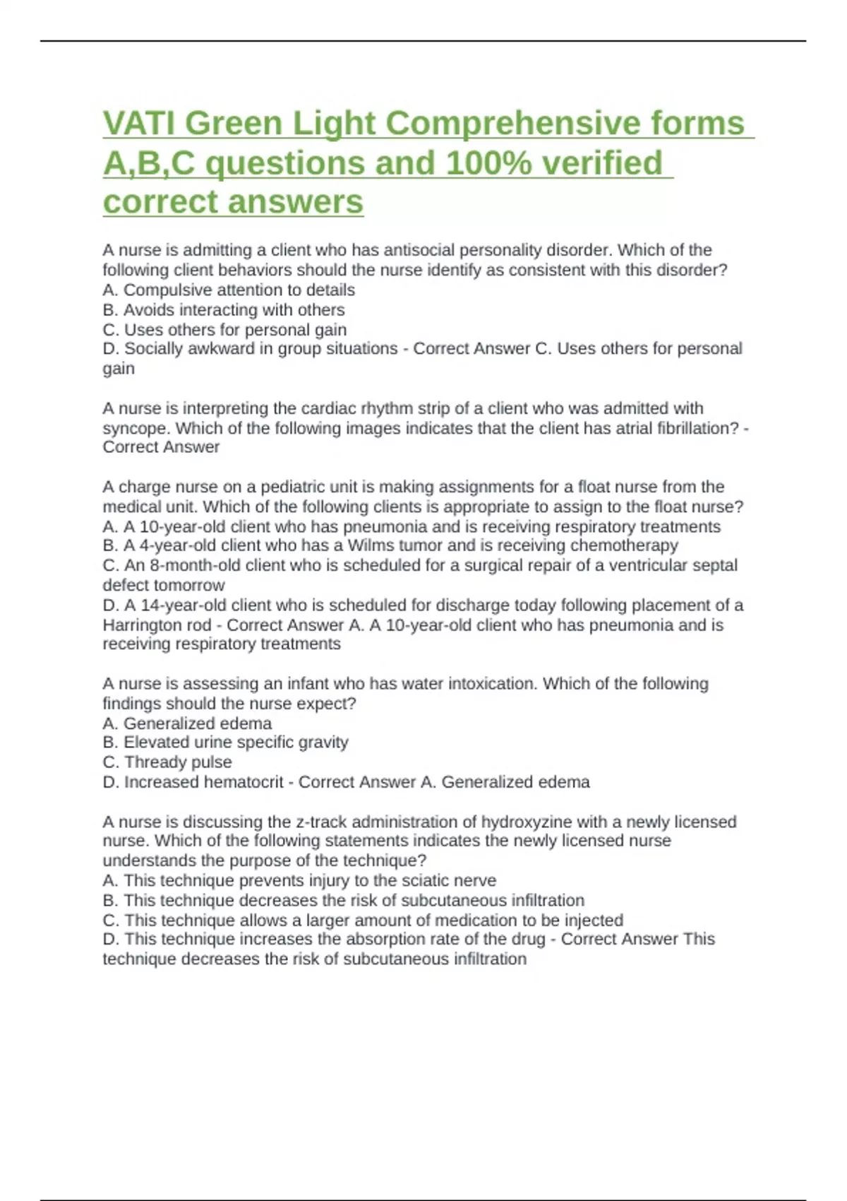 VATI Green Light Comprehensive forms A,B,C questions and 100% verified correct answers A nurse is admitting a client who has antisocial personality disorder. Which of the following client behaviors should the nurse identify as consistent with this disorder? A. Compulsive attention to details B. Avoids interacting with others C. Uses others for personal gain D. Socially awkward in group situations - Correct Answer C. Uses others for personal gain A nurse is interpreting the cardiac rhythm strip of a client who was admitted with syncope. Which of the following images indicates that the client has atrial fibrillation? - Correct Answer A charge nurse on a pediatric unit is making assignments for a float nurse from the medical unit. Which of the following clients is appropriate to assign to the float nurse? A. A 10-year-old client who has pneumonia and is receiving respiratory treatments B. A 4-year-old client who has a Wilms tumor and is receiving chemotherapy C. An 8-month-old client who is scheduled for a surgical repair of a ventricular septal defect tomorrow D. A 14-year-old client who is scheduled for discharge today following placement of a Harrington rod - Correct Answer A. A 10-year-old client who has pneumonia and is receiving respiratory treatments A nurse is assessing an infant who has water intoxication. Which of the following findings should the nurse expect? A. Generalized edema B. Elevated urine specific gravity C. Thready pulse D. Increased hematocrit - Correct Answer A. Generalized edema A nurse is discussing the z-track administration of hydroxyzine with a newly licensed nurse. Which of the following statements indicates the newly licensed nurse understands the purpose of the technique? A. This technique prevents injury to the sciatic nerve B. This technique decreases the risk of subcutaneous infiltration C. This technique allows a larger amount of medication to be injected D. This technique increases the absorption rate of the drug - Correct Answer This technique decreases the risk of subcutaneous infiltration