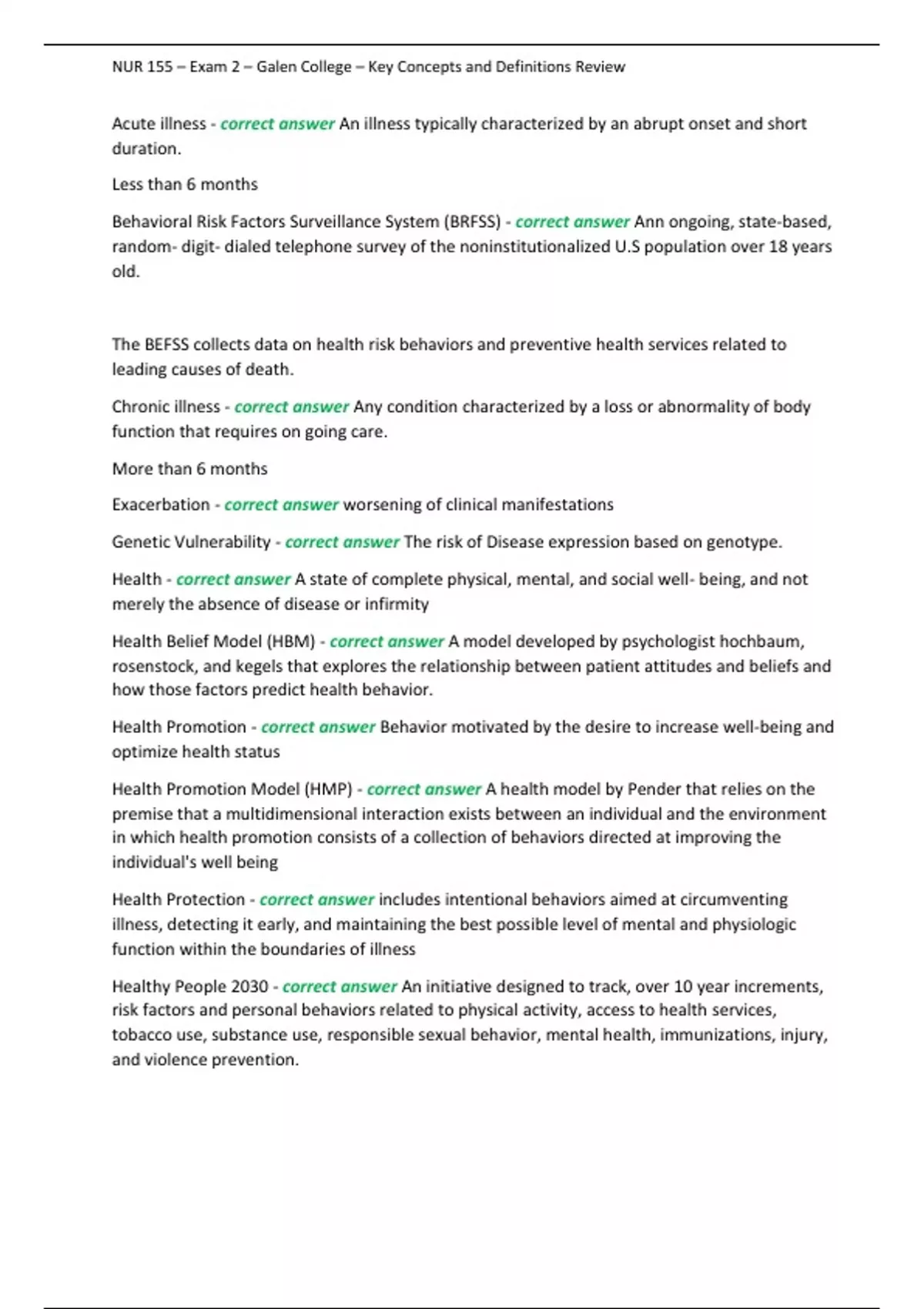 This document is a study guide for Exam 2 of NUR 155 at Galen College, focusing on core nursing concepts such as acute and chronic illness, public health data systems, and behavioral risk factors. It features clear definitions and correct answers to exam-relevant terms, designed to support nursing students in mastering essential course material.