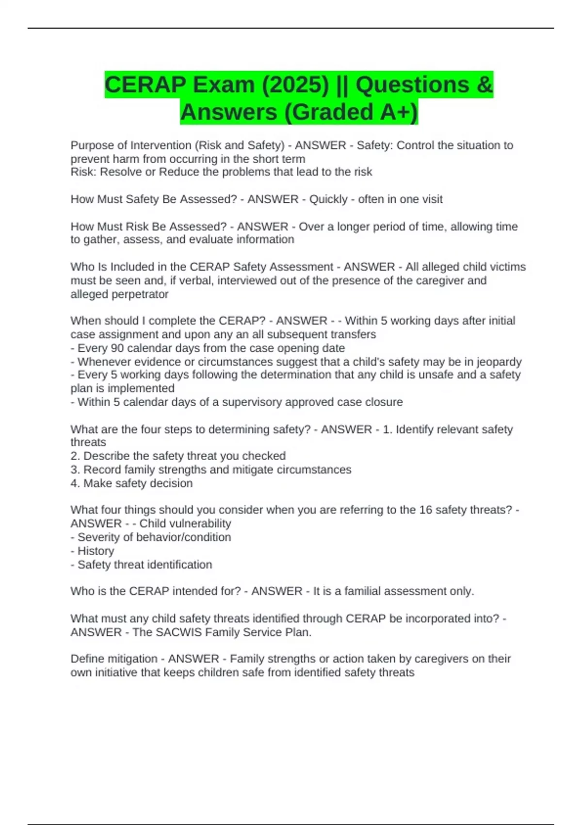 CERAP Exam (2025) || Questions & Answers (Graded A+) CERAP Exam (2025) || Questions & Answers (Graded A+) Purpose of Intervention (Risk and Safety) - ANSWER - Safety: Control the situation to prevent harm from occurring in the short term Risk: Resolve or Reduce the problems that lead to the risk How Must Safety Be Assessed? - ANSWER - Quickly - often in one visit How Must Risk Be Assessed? - ANSWER - Over a longer period of time, allowing time to gather, assess, and evaluate information Who Is Included in the CERAP Safety Assessment - ANSWER - All alleged child victims must be seen and, if verbal, interviewed out of the presence of the caregiver and alleged perpetrator When should I complete the CERAP? - ANSWER - - Within 5 working days after initial case assignment and upon any an all subsequent transfers - Every 90 calendar days from the case opening date - Whenever evidence or circumstances suggest that a child's safety may be in jeopardy - Every 5 working days following the determination that any child is unsafe and a safety plan is implemented - Within 5 calendar days of a supervisory approved case closure What are the four steps to determining safety? - ANSWER - 1. Identify relevant safety threats 2. Describe the safety threat you checked 3. Record family strengths and mitigate circumstances 4. Make safety decision What four things should you consider when you are referring to the 16 safety threats? - ANSWER - - Child vulnerability - Severity of behavior/condition - History - Safety threat identification Who is the CERAP intended for? - ANSWER - It is a familial assessment only. What must any child safety threats identified through CERAP be incorporated into? - ANSWER - The SACWIS Family Service Plan. Define mitigation - ANSWER - Family strengths or action taken by caregivers on their own initiative that keeps children safe from identified safety threats When is a situation determined safe?