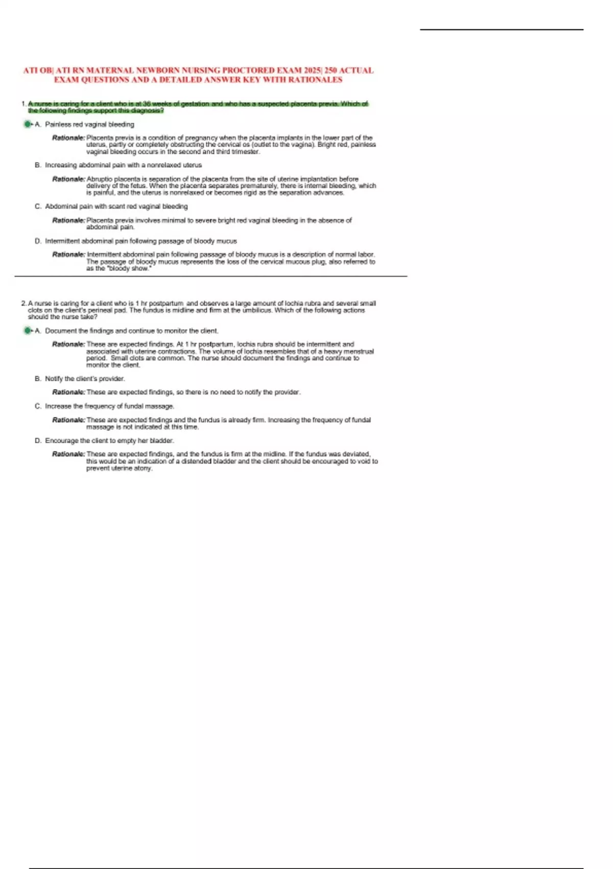 ATI OB| ATI RN MATERNAL NEWBORN NURSING PROCTORED EXAM 2025| 250 ACTUAL EXAM QUESTIONS AND A DETAILED ANSWER KEY
