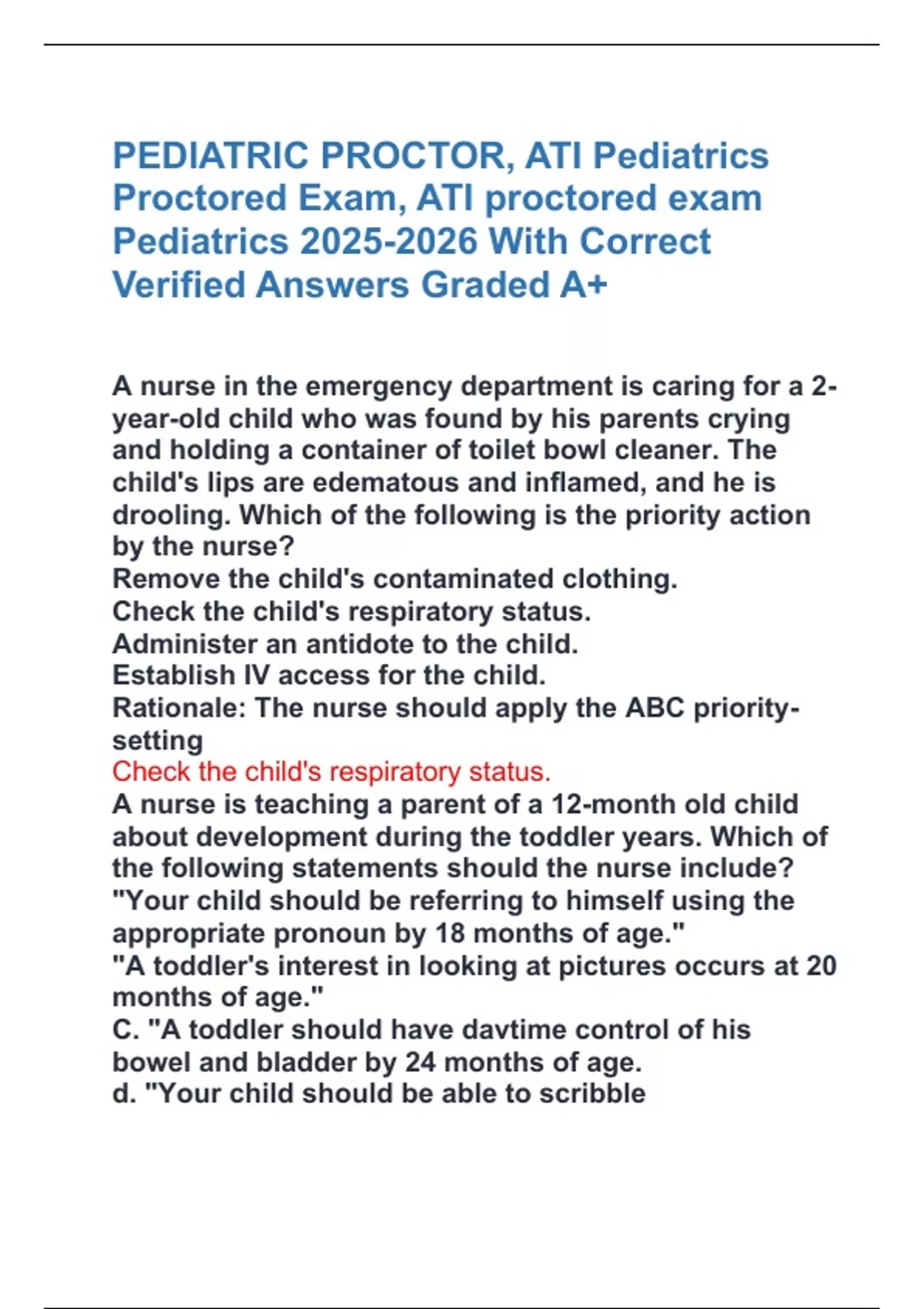 PEDIATRIC PROCTOR, ATI Pediatrics Proctored Exam, ATI proctored exam Pediatrics With Correct Verified Answers Graded A+