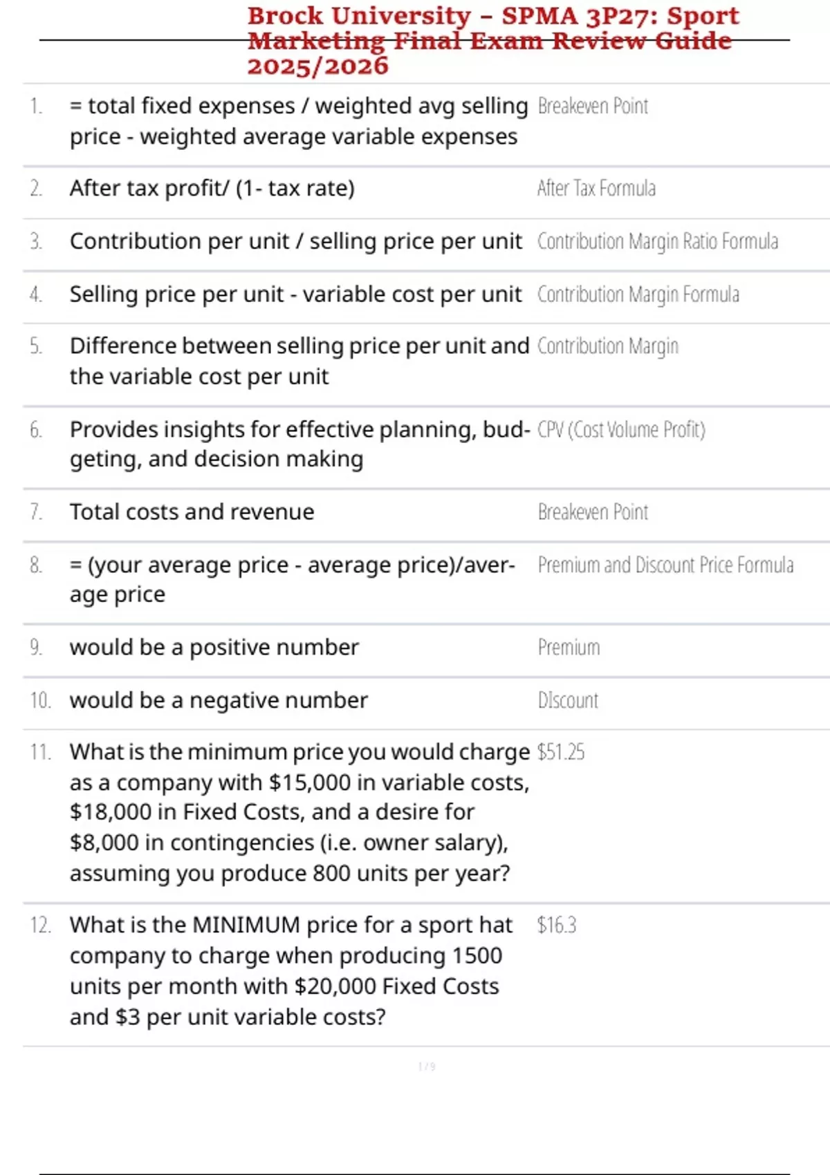 This document is a comprehensive Final Exam Review Guide for SPMA 3P27: Sport Marketing at Brock University, tailored for the 2025/2026 academic year. It covers essential sport marketing principles including market segmentation, branding in sport, sponsorship, consumer behavior, digital engagement, and marketing strategy development. Designed for students in the Sport Management program, the guide includes key concepts, real-world examples, summary tables, and sample questions to aid exam preparation. It is ideal for reinforcing lecture material, organizing study sessions, and building confidence in applying marketing frameworks within the context of sport and recreation industries.