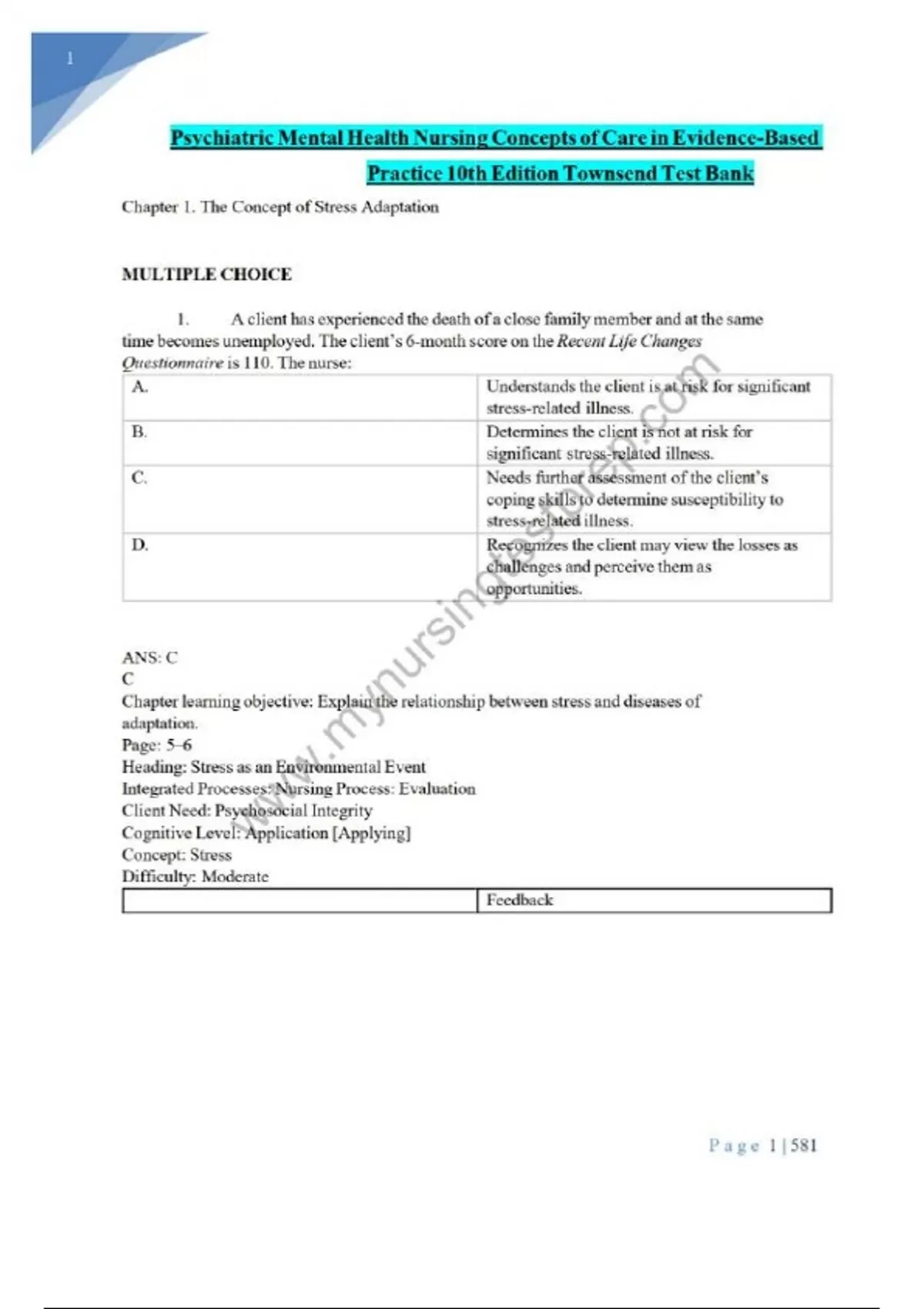 Psychiatric Mental Health Nursing Concepts of Care in Evidence-Based Practice 10th Edition Townsend Test BankPsychiatric Mental Health Nursing Concepts of Care in Evidence-Based Practice 10th Edition Townsend Test Bank