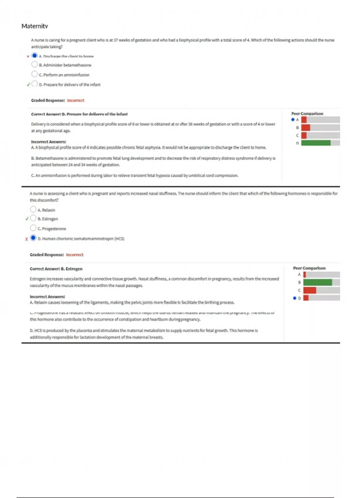 A nurse is planning care for a client who is postpartum. Which of the following strategies should the nurse include in the plan to prevent bladder distention? ! A. Withhold analgesics to prevent urinary retention v B. Run water in the sink while the client sits on the toilet X (Q) C. Perform Credé's maneuver every 4 hours (_) D. Restrict oral hydration Graded Response: Incorrect Correct Answer: B. Run water in the sink while the client sits on the toilet Peer Co Al Running water in the sink, placing the client's hand in warm water, and using a squeeze bottle to run water over the client's perineum can 5 . assist with spontaneous voiding. Incorrect Answers: A. The nurse should administer analgesics as needed to decrease the client's pain during voiding. C. Credé's maneuver is used for clients who are not expected to regain voluntary bladder control. D. Clients who are postpartum will have increased urine output and are at risk for bladder distention. Restricting oral hydration will not prevent bladder distention. A nurse is calculating a pregnant client's estimated date of delivery using Naegele's rule. The client's last menstrual period started on January 20. Which of the following is the client's expected date of delivery? X (’) A. October 13 {_ ) B.November 13 v {_J C.October 27 {_ ) D. November 27 Graded Response: Incorrect Correct Answer: C. October 27 Peer Comparison ol Naegele's rule involves subtracting 3 months from the first day of the last menstrual period and adding 7 days. 8 | incorrect Answers: c I A. An expected date of delivery of October 13 would follow a last menstrual period date of January 6. D I B. An expected date of delivery of November 13 would follow a last menstrual period date of February 6. D. An expected date of delivery of November 27 would follow a last menstrual period date of February 20.