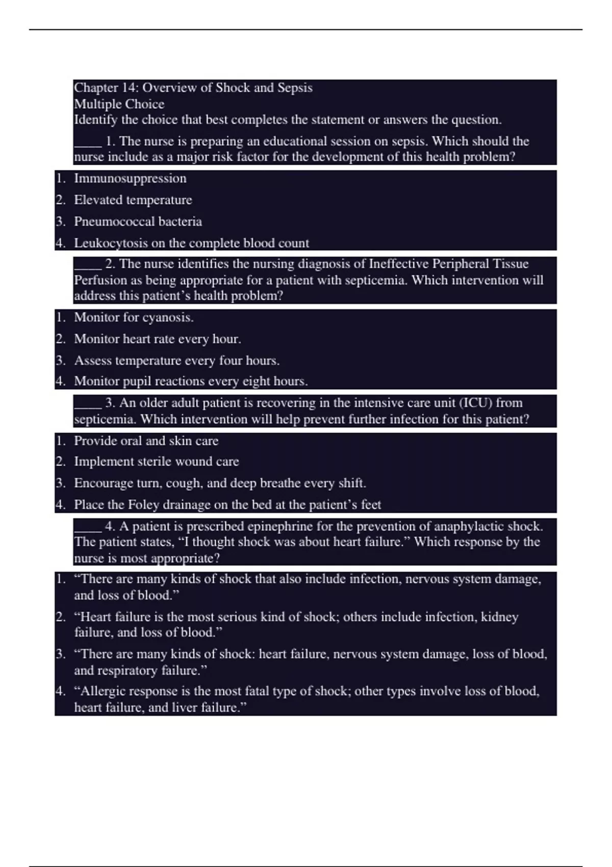 Chapter 14: Overview of Shock and Sepsis Multiple Choice Identify the choice that best completes the statement or answers the question. ____ 1. The nurse is preparing an educational session on sepsis. Which should the nurse include as a major risk factor for the development of this health problem? 1. Immunosuppression 2. Elevated temperature 3. Pneumococcal bacteria 4. Leukocytosis on the complete blood count ____ 2. The nurse identifies the nursing diagnosis of Ineffective Peripheral Tissue Perfusion as being appropriate for a patient with septicemia. Which intervention will address this patient’s health problem? 1. Monitor for cyanosis. 2. Monitor heart rate every hour. 3. Assess temperature every four hours. 4. Monitor pupil reactions every eight hours. ____ 3. An older adult patient is recovering in the intensive care unit (ICU) from septicemia. Which intervention will help prevent further infection for this patient? 1. Provide oral and skin care 2. Implement sterile wound care 3. Encourage turn, cough, and deep breathe every shift. 4. Place the Foley drainage on the bed at the patient’s feet ____ 4. A patient is prescribed epinephrine for the prevention of anaphylactic shock. The patient states, “I thought shock was about heart failure.” Which response by the nurse is most appropriate? 1. “There are many kinds of shock that also include infection, nervous system damage, and loss of blood.” 2. “Heart failure is the most serious kind of shock; others include infection, kidney failure, and loss of blood.” 3. “There are many kinds of shock: heart failure, nervous system damage, loss of blood, and respiratory failure.” 4. “Allergic response is the most fatal type of shock; other types involve loss of blood, heart failure, and liver failure.” ____ 5. An older adult patient is experiencing hypovolemic shock. Which is the priority intervention for this patient? 1. Assessing the cause of bleeding 2. Providing replacement of volume 3. Establishing invasive cardiac monitoring 4. Administering analgesics for control of pain ____ 6. The nurse has just completed the assessment of a patient admitted with a gunshot wound to the femoral artery. Which is the priority nursing diagnosis for this patient? 1. Ineffective Coping 2. Deficient Fluid Volume 3. Decreased Cardiac Output 4. Ineffective Airway Clearance ____ 7. The nurse is administering albumin 5% to a patient in shock. Which nursing action is appropriate when assessing this patient? 1. Auscultate breath sounds for crackles 2. Auscultate breath sounds for hyperresonance 3. Auscultate breath sounds for inspiratory stridor 4. Auscultate for an absence of breath sounds in the lower lobes ____ 8. The nurse explains the purpose of an infusion of albumin 5% to a patient recovering from hypovolemic shock. Which statement indicates that the patient understands the instructions? 1. “It is a protein that pulls water into my blood vessels.” 2. “It is a protein that causes my kidneys to conserve fluid.” 3. “It is a super-concentrated salt solution that helps me conserve body fluid.” 4. “It is a liquid that has electrolytes in it to pull water into my blood vessels.” ____ 9. A patient being treated for hypovolemic shock is prescribed a low dose of dopamine. Which outcome does the nurse anticipate for this patient? 1. Increased cardiac output 2. Stabilization of fluid loss 3. Urinary output of at least 30 mL/hour 4. Vasoconstriction and increased blood pressure ____ 10. A nurse is caring for a patient who was involved in a motor vehicle accident who has lost approximately 1,500 mL of blood. Based on this data, which type of shock is the patient experiencing? 1. Hypovolemic 2. Cardiogenic 3. Distributive 4. Obstructive