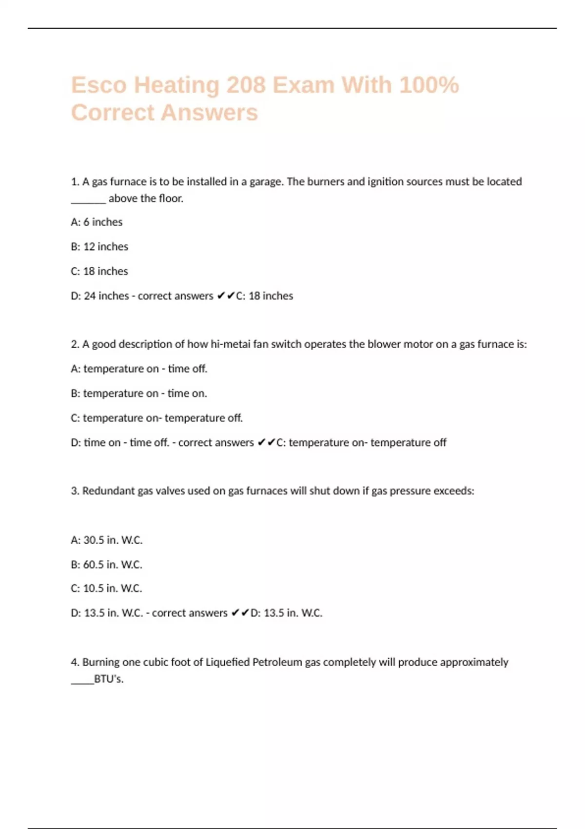 1. A gas furnace is to be installed in a garage. The burners and ignition sources must be located ______ above the floor. A: 6 inches B: 12 inches C: 18 inches D: 24 inches - correct answers C: 18 inches 2. A good description of how hi-metai fan switch operates the blower motor on a gas furnace is: A: temperature on - time off. B: temperature on - time on. C: temperature on- temperature off. D: time on - time off. - correct answers C: temperature on- temperature off 3. Redundant gas valves used on gas furnaces will shut down if gas pressure exceeds: A: 30.5 in. W.C. B: 60.5 in. W.C. C: 10.5 in. W.C. D: 13.5 in. W.C. - correct answers D: 13.5 in. W.C. 4. Burning one cubic foot of Liquefied Petroleum gas completely will produce approximately ____BTU's.