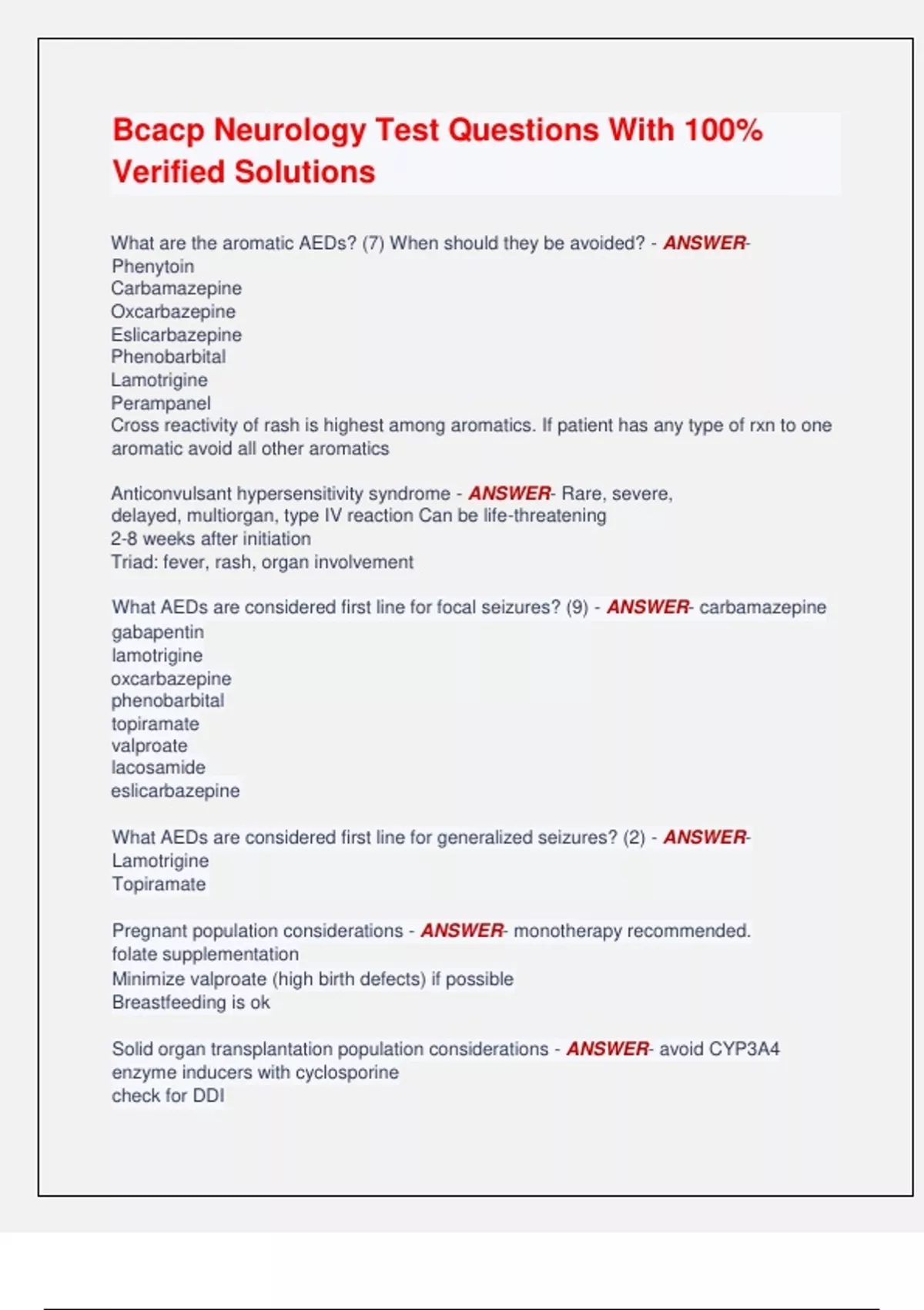 Bcacp Neurology Test Questions With 100% Verified Solutions What are the aromatic AEDs? (7) When should they be avoided? - ANSWER- Phenytoin Carbamazepine Oxcarbazepine Eslicarbazepine Phenobarbital Lamotrigine Perampanel Cross reactivity of rash is highest among aromatics. If patient has any type of rxn to one aromatic avoid all other aromatics Anticonvulsant hypersensitivity syndrome - ANSWER- Rare, severe, delayed, multiorgan, type IV reaction Can be life-threatening 2-8 weeks after initiation Triad: fever, rash, organ involvement What AEDs are considered first line for focal seizures? (9) - ANSWER- carbamazepine gabapentin lamotrigine oxcarbazepine phenobarbital topiramate valproate lacosamide eslicarbazepine What AEDs are considered first line for generalized seizures? (2) - ANSWER- Lamotrigine Topiramate Pregnant population considerations - ANSWER- monotherapy recommended. folate supplementation Minimize valproate (high birth defects) if possible Breastfeeding is ok Solid organ transplantation population considerations - ANSWER- avoid CYP3A4 enzyme inducers with cyclosporine check for DDI 2 MIGRAINE 11 PAGES - ANSWER- types of migraines - ANSWER- cluster tension migraine w/o aura migraine with aura cluster headaches - ANSWER- site of pain: Unilateral, fronto-temporal, periorbital character of pain: searing, excruciating may be accompanied by nasal sx more common in men tension HA - ANSWER- site of pain: bilateral, frontal, occipital character: aching, tight, squeezing migraine - ANSWER- site of pain: Usually unilateral at start; may become bilateral character: Pulsatile, throbbing accompanied by: photophobia, phonophobia, hyperosmia, N/V at least 5 attacks lasting 4-72 hrs first line acute tx of cluster HA - ANSWER- triptan - intranasal or injectable forms oxygen Preventive treatment of cluster HA - ANSWER- short term: corticosteroid burst 1x/year. ergotamines long term: verapamil (gold standard). lithium, gabapentin, topiramate, valproic acid non-pharm tx of migraines - ANSWER- avoid triggers acute tx of tension type HA - ANSWER- analgesics NSAIDs combination anagesics w/ and w/o caffeine preventive tx of tension-type HA - ANSWER- TCAs SSRIs if depression pharmacological acute treatment of migraines classes (4) - ANSWER- analgesics/NSAIDs triptans ergotamines anti-emetics What do you need to qualify as migraine w/ aura - ANSWER- at least 1 fully reversible aura sx. Usually visual sx. may include sensory sx, motor sx. Doesn't last longer than 60 min. Migraine HA follows aura within 60 min. Pharmacological tx of migraine abortive mild to moderate - ANSWER- NSAIDS, ASA, APAP - for mild to moderate NTE 3x/week Antiemetics Avoid opioids and butalbital except as last resort moderate to severe attacks Pharmacological tx of migraine abortive - ANSWER- Triptans, ergotamines, and combination therapy for moderate to severe attacks antiemetics Ergotamines/dihydroergotamines problems - ANSWER- Less specific to targeted receptor(s), thus causing more adverse effects Name the triptans - ANSWER- almotriptan naratriptan eletriptan zolmitriptan sumatriptan rizatriptan frovatriptan What triptans are renally excreted? - ANSWER- Almotriptan, Naratriptan Drug interactions (CYP3A4) - ANSWER- Eletriptan, Zolmitriptan Contraindication with MAOI - ANSWER- Sumatriptan, Rizatriptan, Zolmitriptan Propranolol DDI - ANSWER- Rizatriptan (5 mg dose/15 mg max total) Quickest onset - ANSWER- SQ: Sumatriptan Nasal spray: Sumatriptan and Zolmitriptan Quickest onset PO - ANSWER- Eletriptan, Sumatriptan, Almotriptan, Rizatriptan Longest duration - ANSWER- Frovatriptan, Naratriptan ODT formulation - ANSWER- Rizatriptan, Zolmitriptan Ergotamine DDI - ANSWER- No triptan within 24 hours Name the antiemetics for use in migraine tx - ANSWER- metoclopramide, promethazine, and prochlorperazine