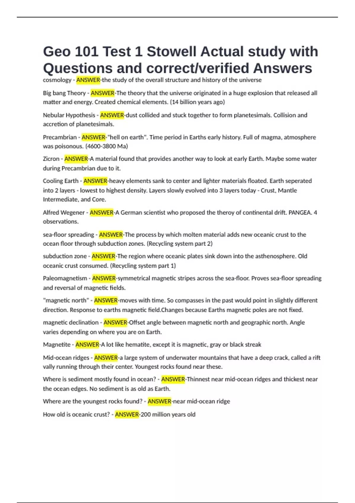 Geo 101 Test 1 Stowell Actual study with Questions and correct/verified Answers