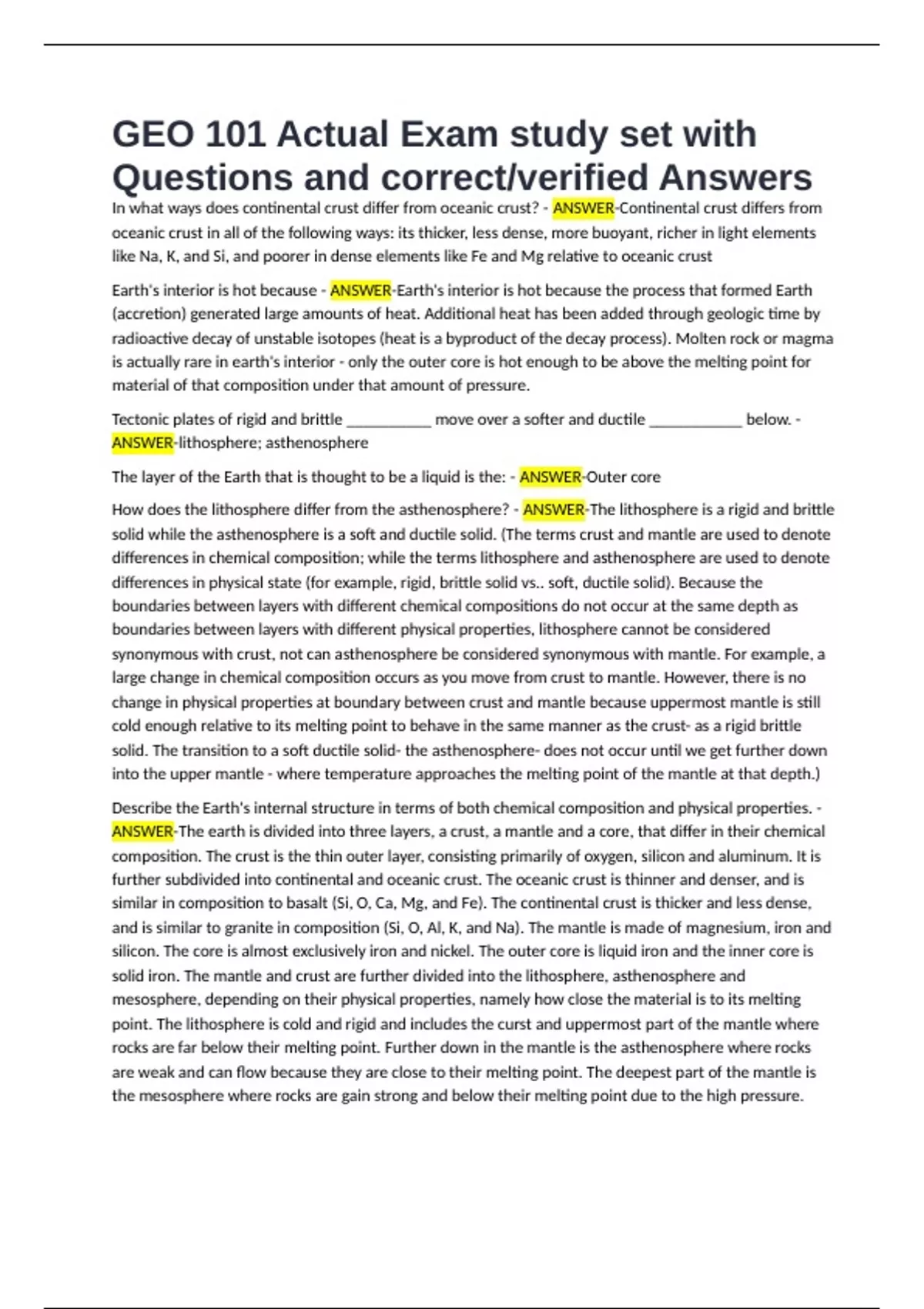 GEO 101 Actual Exam study set with Questions and correct/verified Answers