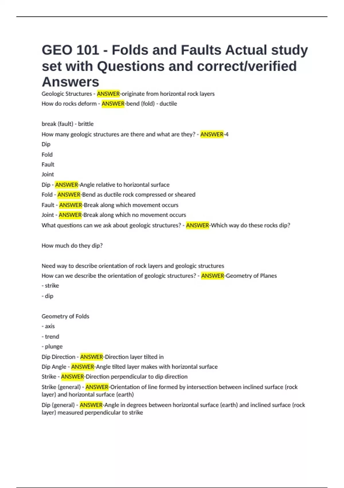 GEO 101 - Folds and Faults Actual study set with Questions and correct/verified Answers