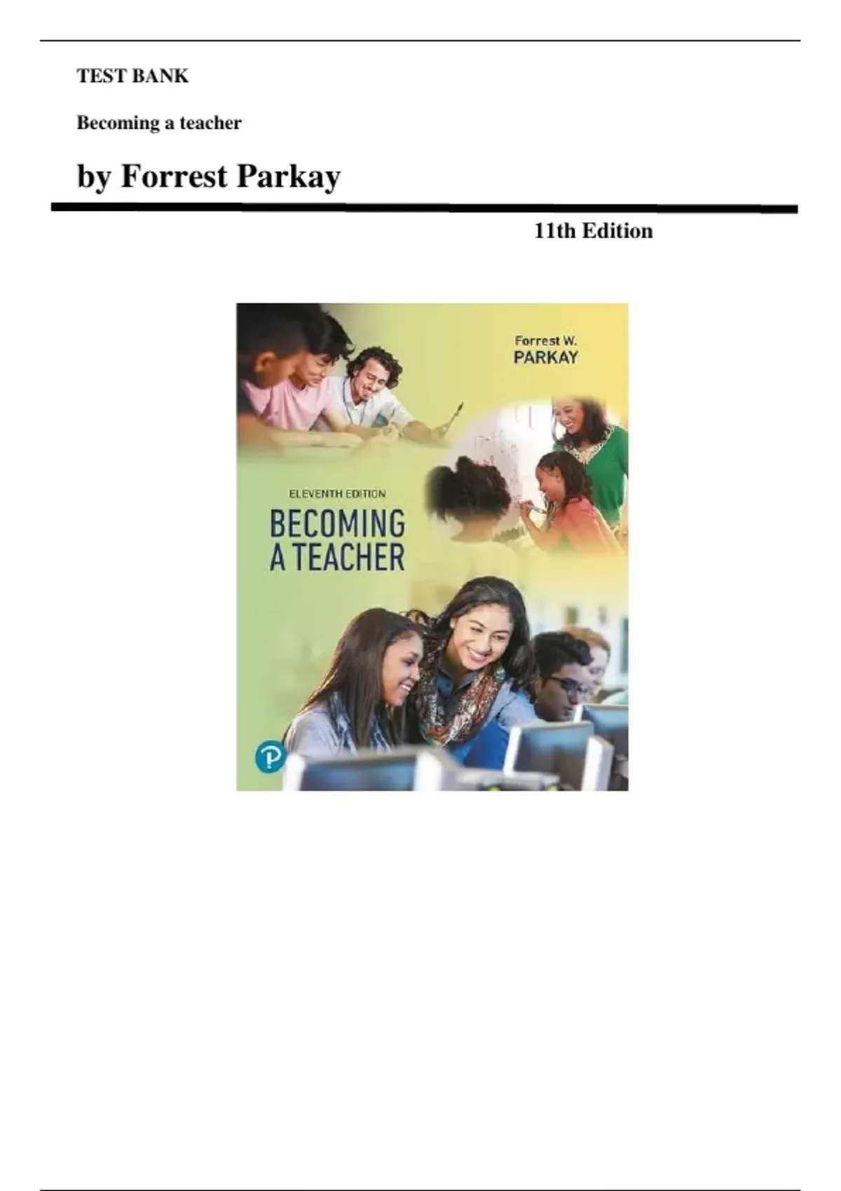 Test Bank for Becoming a Teacher 11th Edition by Forrest Parkay, All Chapters. 1. Teaching: Your Chosen Profession, 2. Today's Teachers, 3. Today's Schools, 4. Philosophical Foundations of U.S. Education, 5. Historical Foundations of U.S. Education, 6. Governance and Finance of U.S. Schools, 7. Ethical and Legal Issues in U.S. Education, 8. Today's Students, 9. Addressing Learners' Individual Needs, 10. Creating a Community of Learners, 11. Curriculum, Standards, Assessment, and Student Learning, 12. Integrating Technology into Teaching, 13. Your Teaching Future