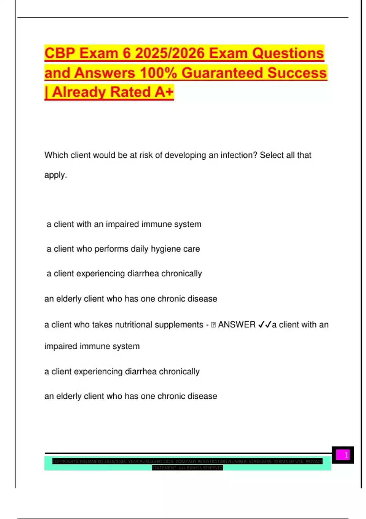 CBP Exam 6 2025/2026 Exam Questions and Answers 100% Guaranteed Success | Already Rated A+ Which client would be at risk of developing an infection? Select all that apply. a client with an impaired immune system a client who performs daily hygiene care a client experiencing diarrhea chronically an elderly client who has one chronic disease a client who takes nutritional supplements -