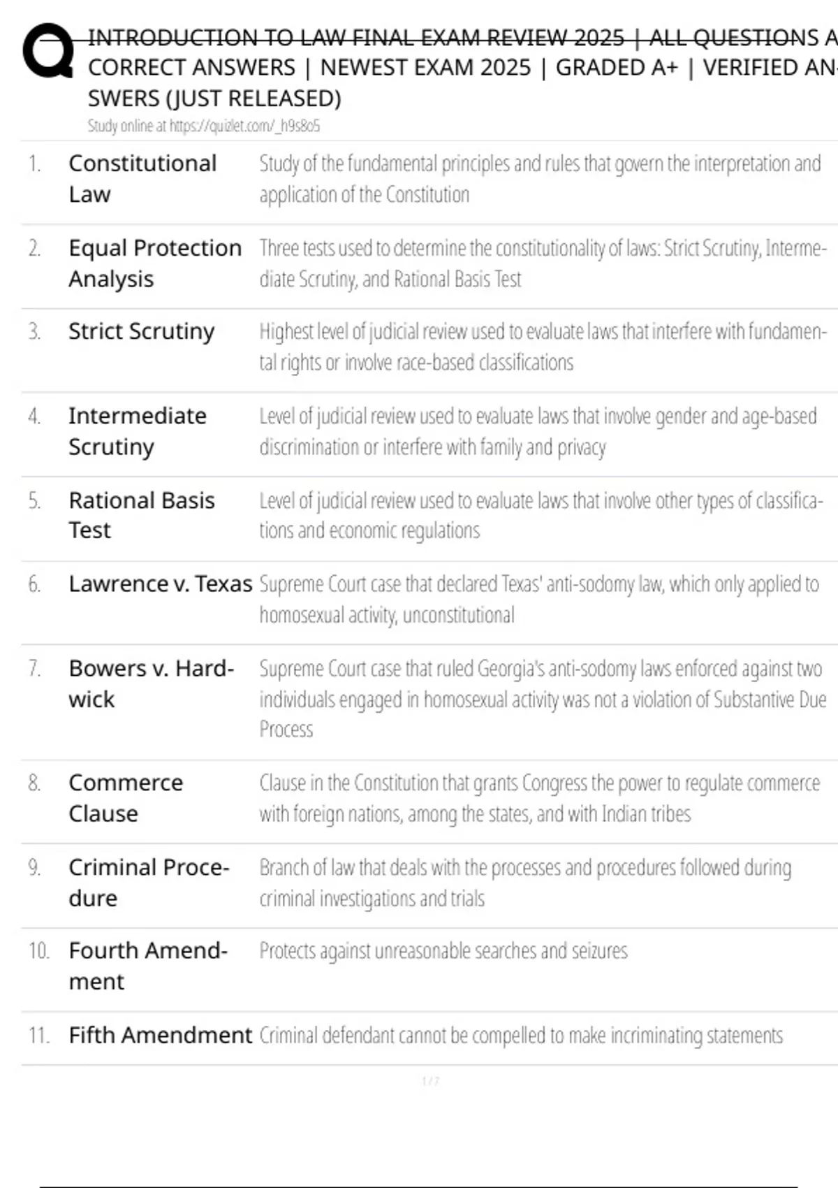 INTRODUCTION TO LAW FINAL EXAM REVIEW 2025 | ALL QUESTIONS AND CORRECT ANSWERS | NEWEST EXAM 2025 | GRADED A+ | VERIFIED AN SWERS (JUST RELEASED) Study online at 1. Constitutional Law Study of the fundamental principles and rules that govern the interpretation and application of the Constitution 2. Equal Protection Analysis Three tests used to determine the constitutionality of laws: Strict Scrutiny, Interme diate Scrutiny, and Rational Basis Test 3. Strict Scrutiny Highest level of judicial review used to evaluate laws that interfere with fundamen tal rights or involve race-based classifications 4. Intermediate Scrutiny Level of judicial review used to evaluate laws that involve gender and age-based discrimination or interfere with family and privacy 5. Rational Basis Test Level of judicial review used to evaluate laws that involve other types of classifica tions and economic regulations 6. Lawrence v. Texas Supreme Court case that declared Texas' anti-sodomy law, which only applied to homosexual activity, unconstitutional 7. Bowers v. Hard wick Supreme Court case that ruled Georgia's anti-sodomy laws enforced against two individuals engaged in homosexual activity was not a violation of Substantive Due Process 8. Commerce Clause Clause in the Constitution that grants Congress the power to regulate commerce with foreign nations, among the states, and with Indian tribes 9. Criminal Proce dure Branch of law that deals with the processes and procedures followed during criminal investigations and trials 10. Fourth Amend ment Protects against unreasonable searches and seizures 11. Fifth Amendment Criminal defendant cannot be compelled to make incriminating statements 1 / 7 INTRODUCTION TO LAW FINAL EXAM REVIEW 2025 | ALL QUESTIONS AND CORRECT ANSWERS | NEWEST EXAM 2025 | GRADED A+ | VERIFIED AN SWERS (JUST RELEASED) Study online at 12. Sixth Amend ment Guarantees a right to counsel 13. Miranda v. Ari zona Supreme Court case that established the requirement for police to read a suspect their rights before conducting a custodial interrogation 14. Seibert case Case involving a woman who confessed to setting a fatal fire without being informed of her Miranda rights; Supreme Court ruled that both confessions were excluded from evidence 15. Gideon v. Wain right Supreme Court case that specified that counsel must be provided to all criminal defendants who cannot afford an attorney 16. Strickland v. Washington Supreme Court case that specified that ineffective assistance of counsel is a denial of a criminal defendant's 6th Amendment right to an attorney 17. Exclusionary Rule Rule that precludes items or confessions obtained unconstitutionally from being offered as evidence