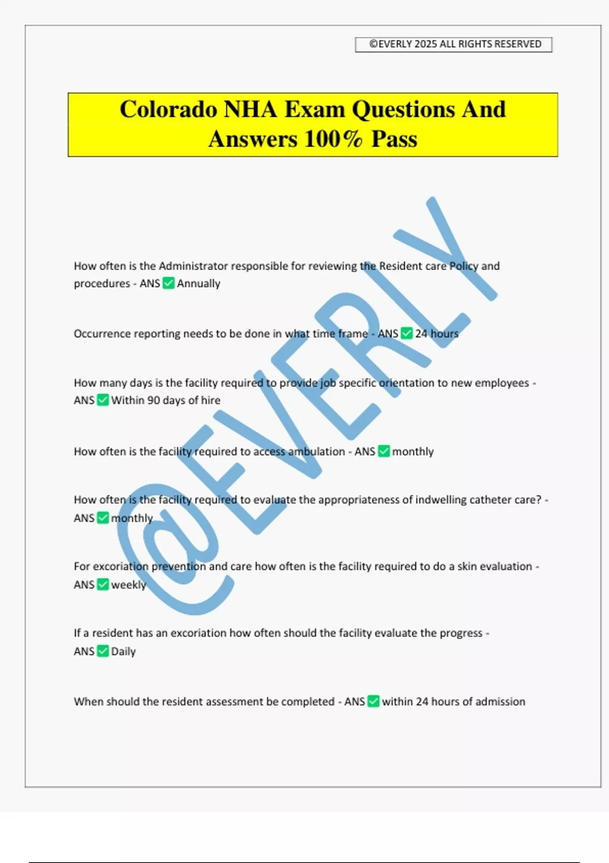 Colorado NHA Exam Questions And Answers 100% Pass How often is the Administrator responsible for reviewing the Resident care Policy and procedures - ANS Annually Occurrence reporting needs to be done in what time frame - ANS 24 hours How many days is the facility required to provide job specific orientation to new employees - ANS Within 90 days of hire How often is the facility required to access ambulation - ANS monthly How often is the facility required to evaluate the appropriateness of indwelling catheter care? - ANS monthly For excoriation prevention and care how often is the facility required to do a skin evaluation - ANS weekly If a resident has an excoriation how often should the facility evaluate the progress - ANS Daily When should the resident assessment be completed - ANS within 24 hours of admission ©EVERLY 2025 ALL RIGHTS RESERVED who is responsible to perform the resident assessment? - ANS Licensed Nurse What areas are covered in the resident assessment of a new resident? - ANS physical, mental and functional How many days does the facility have to access the discharge of a patient - ANS 7 days how often after the initial discharge assessment should the facility evaluate the discharge potential of the resident - ANS every 3 months or when there is a change of condition Who is responsible for performing the discharge potential of a resident - ANS nursing, dietary and activity When does the nursing care plan need to be completed - ANS within 24 hours what departments participate in the care plan - ANS nursing, social services and activities how long does the activities department have to complete the history and assessment - ANS 2 weeks who is responsible for the anticipated schedule of visits for a patient - ANS attending physician how often should the physician see the patient - ANS no less than every 6 months how often should the attending physician write a progress note - ANS after each visit how often should the attending physician perform a written evaluation - ANS once a year ©EVERLY 2025 ALL RIGHTS RESERVED How many hours are required in a nursing care facility per resident/per day - ANS 2 hours How often should written policies be evaluated - ANS at least annually When should med errors and drug interactions be reported - ANS within 30 minutes After a med error or drug interaction how long should the resident be monitored? - ANS 72 hours How often should a resident be evaluated for tardive dyskina (because of psychoactive meds) - ANS every 3 months When a resident is in physical restraints how often should they be monitored - ANS every 15 minutes when a resident is in physical restraints how often should the restraints be removed - ANS every 2 hours during waking hours If a resident is using a safety device how often should they be assessed - ANS physical and functional assessment after first 24 hours, at the end of the week and monthly How often should a resident using a safety device be monitored - ANS every 2 hours (monitored and documented) How often does social services update the care plan - ANS every 6 months how often does social servic