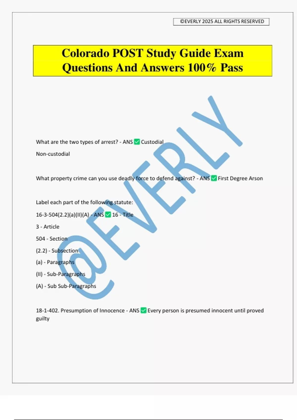 Colorado POST Study Guide Exam Questions And Answers 100% Pass What are the two types of arrest? - ANS Custodial Non-custodial What property crime can you use deadly force to defend against? - ANS First Degree Arson Label each part of the following statute: 16-3-504(2.2)(a)(II)(A) - ANS 16 - Title 3 - Article 504 - Section (2.2) - Subsection (a) - Paragraphs (II) - Sub-Paragraphs (A) - Sub Sub-Paragraphs 18-1-402. Presumption of Innocence - ANS Every person is presumed innocent until proved guilty ©EVERLY 2025 ALL RIGHTS RESERVED 18-1-403. Legal Assistance and Supporting Services - ANS All indigent persons who are charged with or held for the commission of a crime are entitled to legal representation and supporting services at the state's expense 18-1-404 Preliminary hearing or waiver-dispositional hearing - ANS Every person accused of a class 1, 2, or 3 felony or level 1 or level 2 drug felony has the right to demand and receive a preliminary hearing within a reasonable time to determine whether PC exists Only those persons charged with a class 4, 5, or 6 felony that requires mandatory sentencing, or is charged with a crime of violence or sexual offense, shall have the right to demand and receive a preliminary hearing within a reasonable time to determine whether PC exists How long for a speedy trial? - ANS 180 days from the date of entry of a not guilty plea 18-1-405 How many jurors on a felony trial? - ANS 12 How many jurors on a misdemeanor trial? - ANS 6 18-1-407 Affirmative Defense - ANS means that unless the state's evidence raises the issue involving the alleged defense, the defendant, to raise the issue, shall present some credible evidence on that issue If the issue involved in an affirmative defense is raised, then the guilt of the defendant must be... - ANS established beyond a reasonable doubt as to that issue as well as all other elements of the offense Act - ANS a bodily movement, and includes words and possession of property ©EVERLY 2025 ALL RIGHTS RESERVED Conduct - ANS an act or omission and its accompanying state of mind or, where relevant, a series of acts of omissions Criminal Negligence - ANS through a gross deviation from the standard of care that a reasonable person would exercise, he fails to perceive a substantial and unjustifiable risk that a result will occur or that a circumstance exists Culpable Mental State - ANS Intentionally Knowingly Recklessly Criminal negligence Intentionally - ANS when his conscious objective is to cause the specific result proscribed by the statute defining the offense Knowingly - ANS when he is aware that his conduct is of such nature or that such circumstance exists when he is aware that his conduct is practically certain to cause the result Omission - ANS a failure to perform an act as to which a duty of performance is imposed by law Recklessly - ANS when he consciously disregards a substantial and unjustifiable risk that a result will occur or that a circumstance exists Voluntary Act - ANS an act performed consciously as a result of effort or determination, and includes the possession of property if the actor was aware of his physical possession of property if the actor was aware of his physical possession or control thereof for a sufficient period to have been able
