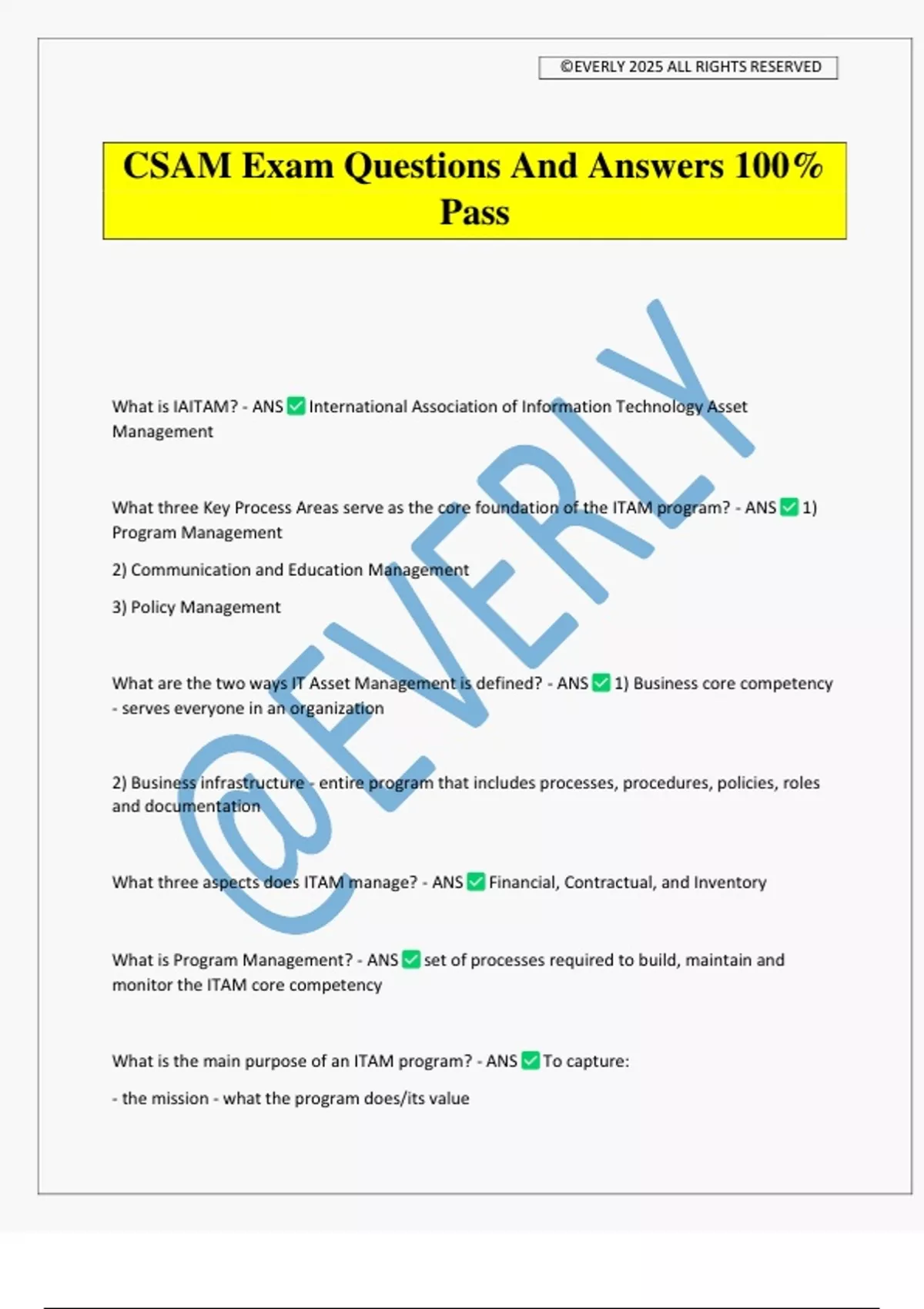 CSAM Exam Questions And Answers 100% Pass What is IAITAM? - ANS International Association of Information Technology Asset Management What three Key Process Areas serve as the core foundation of the ITAM program? - ANS 1) Program Management 2) Communication and Education Management 3) Policy Management What are the two ways IT Asset Management is defined? - ANS 1) Business core competency - serves everyone in an organization 2) Business infrastructure - entire program that includes processes, procedures, policies, roles and documentation What three aspects does ITAM manage? - ANS Financial, Contractual, and Inventory What is Program Management? - ANS set of processes required to build, maintain and monitor the ITAM core competency What is the main purpose of an ITAM program? - ANS To capture: - the mission - what the program does/its value ©EVERLY 2025 ALL RIGHTS RESERVED - strategies and objectives - defines the roadmap which supports the mission - measurements - feedback to determine the effectiveness of ITAM program - prioritization What is the secondary purpose of an ITAM program? - ANS to market the value of ITAM through informing and gathering cooperation What are two main characteristics of ITAM as a program? - ANS PERMANENT - not going away Process-centric What are policies? - ANS WHAT needs to be accomplished WHO the audience WHY a policy is important - the path of action determined as mandatory What are procedures? - ANS HOW a task should be performed Three goals of policy management - ANS 1) Effective implementation, including awareness 2) Uniform enforcement of policies 3) Periodic review and update of policies to maintain relevance What is a needs analysis? - ANS ensuring that team member goals are validated or contrasted against organizational requirements