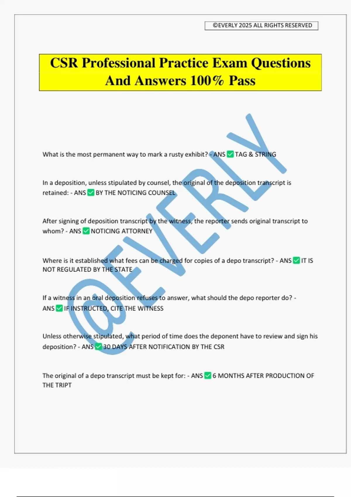 CSR Professional Practice Exam Questions And Answers 100% Pass What is the most permanent way to mark a rusty exhibit? - ANS TAG & STRING In a deposition, unless stipulated by counsel, the original of the deposition transcript is retained: - ANS BY THE NOTICING COUNSEL After signing of deposition transcript by the witness, the reporter sends original transcript to whom? - ANS NOTICING ATTORNEY Where is it established what fees can be charged for copies of a depo transcript? - ANS IT IS NOT REGULATED BY THE STATE If a witness in an oral deposition refuses to answer, what should the depo reporter do? - ANS IF INSTRUCTED, CITE THE WITNESS Unless otherwise stipulated, what period of time does the deponent have to review and sign his deposition? - ANS 30 DAYS AFTER NOTIFICATION BY THE CSR The original of a depo transcript must be kept for: - ANS 6 MONTHS AFTER PRODUCTION OF THE TRIPT ©EVERLY 2025 ALL RIGHTS RESERVED Upon completion of the depo tript, the first thing the reporter should do is: - ANS SIGN A CERTIFICATE If you pay a scopist over $600, you must give her a: - ANS 1099 If a reporter pays a scopist over $600, he/she must report that to: - ANS IRS & Franchise Tax Board If a depo is not taken stenographically, who has to agree on another means? - ANS ALL PARTIES PRESENT AT THE DEPO When the attorney who gives you notice for a depo does not show up and the opposing attorney wants to enter a statement on the record, you should: - ANS TAKE DOWN THE STATEMENT When directed by an attorney to split the original and copy, the reporter should: - ANS SPLIT THE COST OF THE TRIPT Which of the following appears on the cover sheet and reporters certificate? - ANS REPORTER'S CSR NUMBER Notify the CRB of your change of address: - ANS WITHIN 30 DAYS When should a depo reporter go off the record? - ANS WHEN ALL PARTIES STIPULATE A reporter must certify that the deposition is true and correct by signing a/an: - ANS CERTIFICATE Which of the following does not appear in a caption? - ANS THE NATURE OF THE DAMAGES ©EVERLY 2025 ALL RIGHTS RESERVED After a transcription is made of a depo and notice has been given that it is ready for corrections and signing, the deponent must respond: - ANS WITHIN 30 DAYS The party taking the deposition is called the: - ANS DEPOSING PARTY When you retire as a reporter, with whom do you file your depo notes and transcripts? - ANS COURT CLERK If a witness refuses to swear to God under oath, a depo reporter should: - ANS AFFIRM HIM In a Workers' Compensation case, the Applicant is entitled to: - ANS ADJUDICATION WITHIN 90 DAYS After completion of the deposition, who signs the certificate? - ANS REPORTER Violation of Chapter 13 of the Business and Professions Code is a/an: - ANS MISDEMEANOR All deposition reporters must retain their transcribed notes for how long following transcription? - ANS ONE YEAR All depo reporters must retain their UNTRANSCRIBED notes for how long? - ANS EIGHT YEARS How must UNTRANSCRIBED notes be retained? - ANS PAPER NOTES OR ELECTRONIC MEDIA, AS LONG AS IT ALLOWS FOR SATISFACTORY PRODUCTION OF A TRIPT AT ANY TIME DURING THE PERIODS SPECIFIED. When you freelance, when