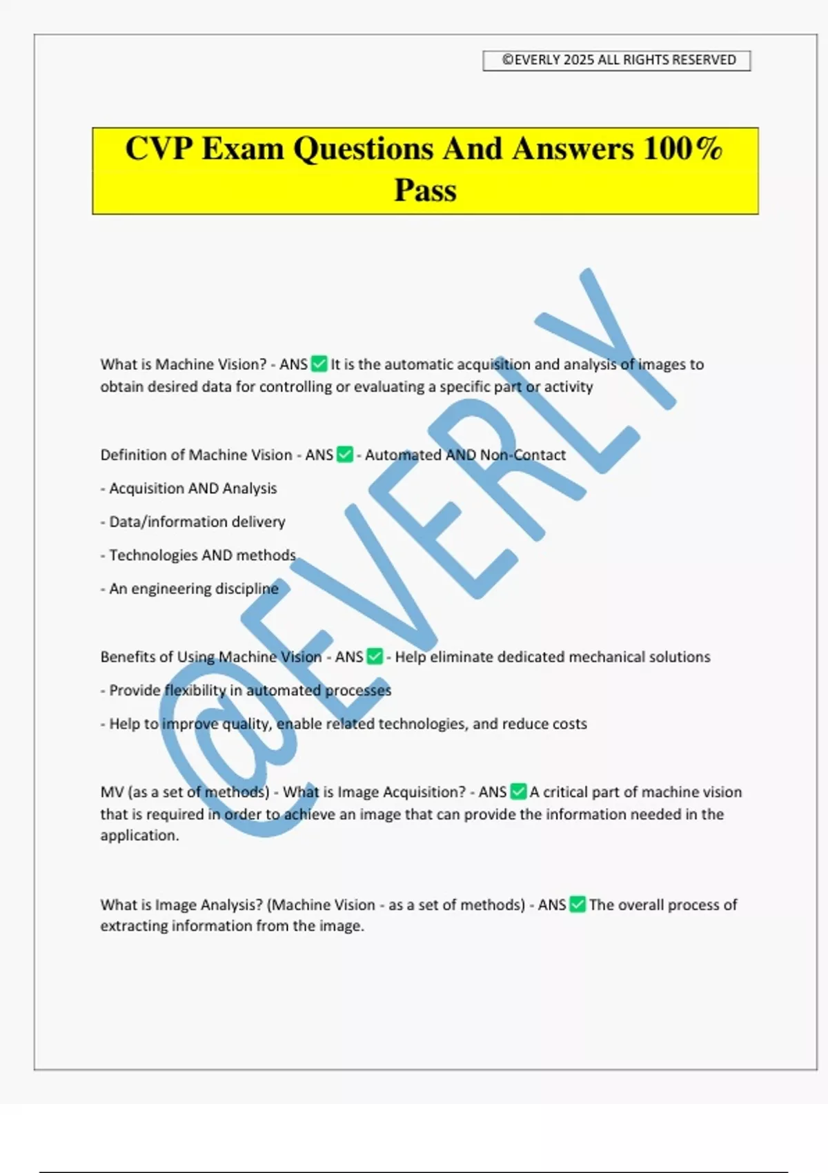 CVP Exam Questions And Answers 100% Pass What is Machine Vision? - ANS It is the automatic acquisition and analysis of images to obtain desired data for controlling or evaluating a specific part or activity Definition of Machine Vision - ANS - Automated AND Non‐Contact - Acquisition AND Analysis - Data/information delivery - Technologies AND methods - An engineering discipline Benefits of Using Machine Vision - ANS - Help eliminate dedicated mechanical solutions - Provide flexibility in automated processes - Help to improve quality, enable related technologies, and reduce costs MV (as a set of methods) - What is Image Acquisition? - ANS A critical part of machine vision that is required in order to achieve an image that can provide the information needed in the application. What is Image Analysis? (Machine Vision - as a set of methods) - ANS The overall process of extracting information from the image. ©EVERLY 2025 ALL RIGHTS RESERVED Includes tasks like pre‐processing, feature extraction, object segmentation, identification, measurement and more. What is Data/Results Integration? (Information gained from the image....) - ANS Making real‐ world decisions about the information gained from the image. The link to the automation process "Machine Vision" or "Computer Vision" (definition, differences) - ANS Computer vision most commonly refers to the use of AI techniques for classification of objects (e.g. neural networks and deep learning) to make computers "see" in a perceptive way that mimics humans; streaming video and continuous process Machine vision most commonly refers to the use of discrete feature extraction and rule‐based comparisons to make decisions directly on image data, 1‐1 relationship part to process "Machine Vision" vs "Computer Vision" (definition continued) - ANS Machine vision uses a wide variety of tools including those that are most often considered exclusive to "computer vision" (deep learning for example) along with rule‐based or discrete feature extraction and analysis Machine vision is not necessarily a subset of computer vision and computer vision is not necessarily a subset of machine vision In some cases, the capability of the tools described as rule‐based/discrete (machine vision) and learning‐based (computer vision) overlap and either might work well for a target application MV Definition - "Inspect" - ANS Check presence/absence, detect defects, verify assembly, differentiate colors, count objects MV Definition - "Locate/Guide" - ANS Find randomly oriented features or object is 2D and 3D space, perhaps provide real-world coordinates for robotic or motion guidance MV Definition - "Meas