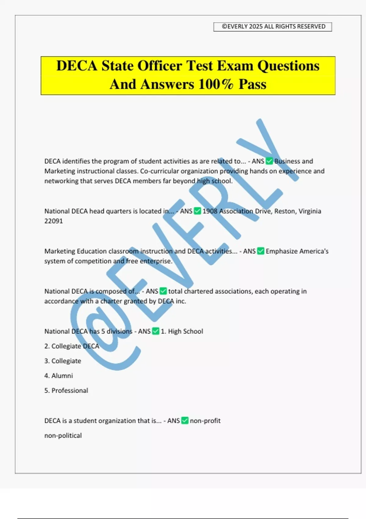 DECA State Officer Test Exam Questions And Answers 100% Pass DECA identifies the program of student activities as are related to... - ANS Business and Marketing instructional classes. Co-curricular organization providing hands on experience and networking that serves DECA members far beyond high school. National DECA head quarters is located in... - ANS 1908 Association Drive, Reston, Virginia 22091 Marketing Education classroom instruction and DECA activities... - ANS Emphasize America's system of competition and free enterprise. National DECA is composed of... - ANS total chartered associations, each operating in accordance with a charter granted by DECA inc. National DECA has 5 divisions - ANS 1. High School 2. Collegiate DECA 3. Collegiate 4. Alumni 5. Professional DECA is a student organization that is... - ANS non-profit non-political ©EVERLY 2025 ALL RIGHTS RESERVED nonsectarian The purposes of DECA are... - ANS 1. Assist state associations in the growth and development of DECA 2. To further develop education in marketing and management that will lead to careers and occupations 3. To promote understanding and appreciation for the responsibilities of citizenship in out free, competitive enterprise system in the members National DECA week... - ANS Can be held between the months of October and November The purpose of National DECA week... - ANS 1. To call attention to the Marketing Education program 2. To enhance the educational facilities of your school 3. To highlight the activities of DECA National DECA has an adult and student governing body... - ANS The adult governing body of national DECA is the DECA inc. Students elect national officers to serve as representatives for their region DECA inc is the legal sponsoring agency of DECA... - ANS Its membership is composed of the head state person responsible for marketing education or an appointed representative in each chartered association DECA inc has one annual meeting... - ANS Help at a designated time and place to coincide with the annual DECA Chapter Association Management (CAM) Conference DECA inc has an... - ANS 8 member Board of Directors. The Board of Directions of DECA meets as needed to set all policies of DECA.