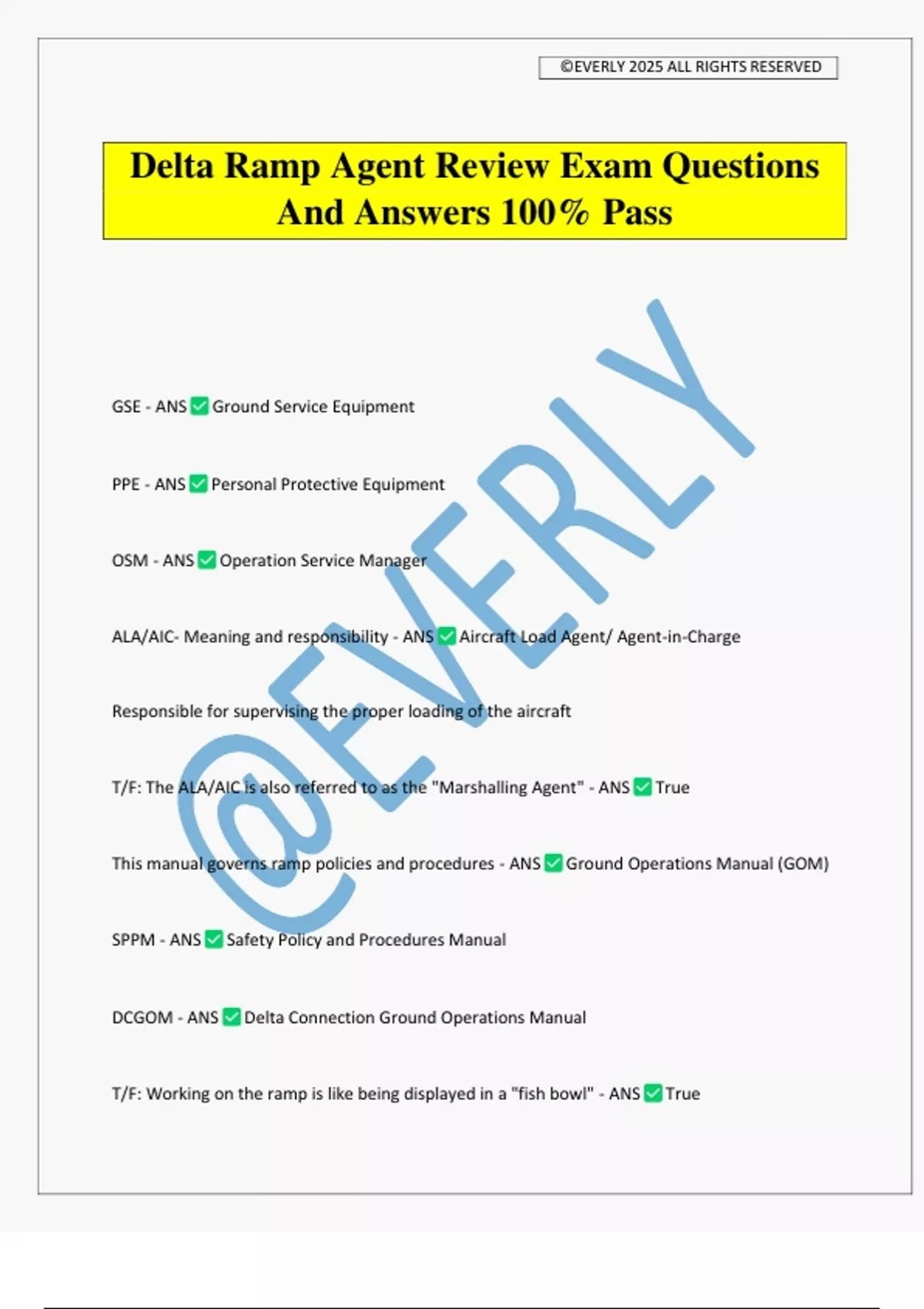 Delta Ramp Agent Review Exam Questions And Answers 100% Pass GSE - ANS Ground Service Equipment PPE - ANS Personal Protective Equipment OSM - ANS Operation Service Manager ALA/AIC- Meaning and responsibility - ANS Aircraft Load Agent/ Agent-in-Charge Responsible for supervising the proper loading of the aircraft T/F: The ALA/AIC is also referred to as the "Marshalling Agent" - ANS True This manual governs ramp policies and procedures - ANS Ground Operations Manual (GOM) SPPM - ANS Safety Policy and Procedures Manual DCGOM - ANS Delta Connection Ground Operations Manual T/F: Working on the ramp is like being displayed in a "fish bowl" - ANS True ©EVERLY 2025 ALL RIGHTS RESERVED What are the two types of customers? - ANS - External Customer - Internal Customer What is an External customer? - ANS A person outside the organization who purchase's Delta's services or products What is an Internal customer? - ANS A person inside the organization of business partner we support by our efforts What is a flight number? - ANS A numeric designator that uniquely identifies a particular Delta flight in one direction from origination to destination What is a flight that begins in your station called referred to as? - ANS Originator What a flight that ends in your station referred to as? - ANS Terminator What is a flight that arrives in your station and continues to another station (with the same flight number) referred to as? - ANS Thru flight What are required PPE items? - ANS 1. Steel-toed shoes 2. Hearing protection 3. safety vests (high visibility) Fill in the blanks: ___ hands, ___ bag