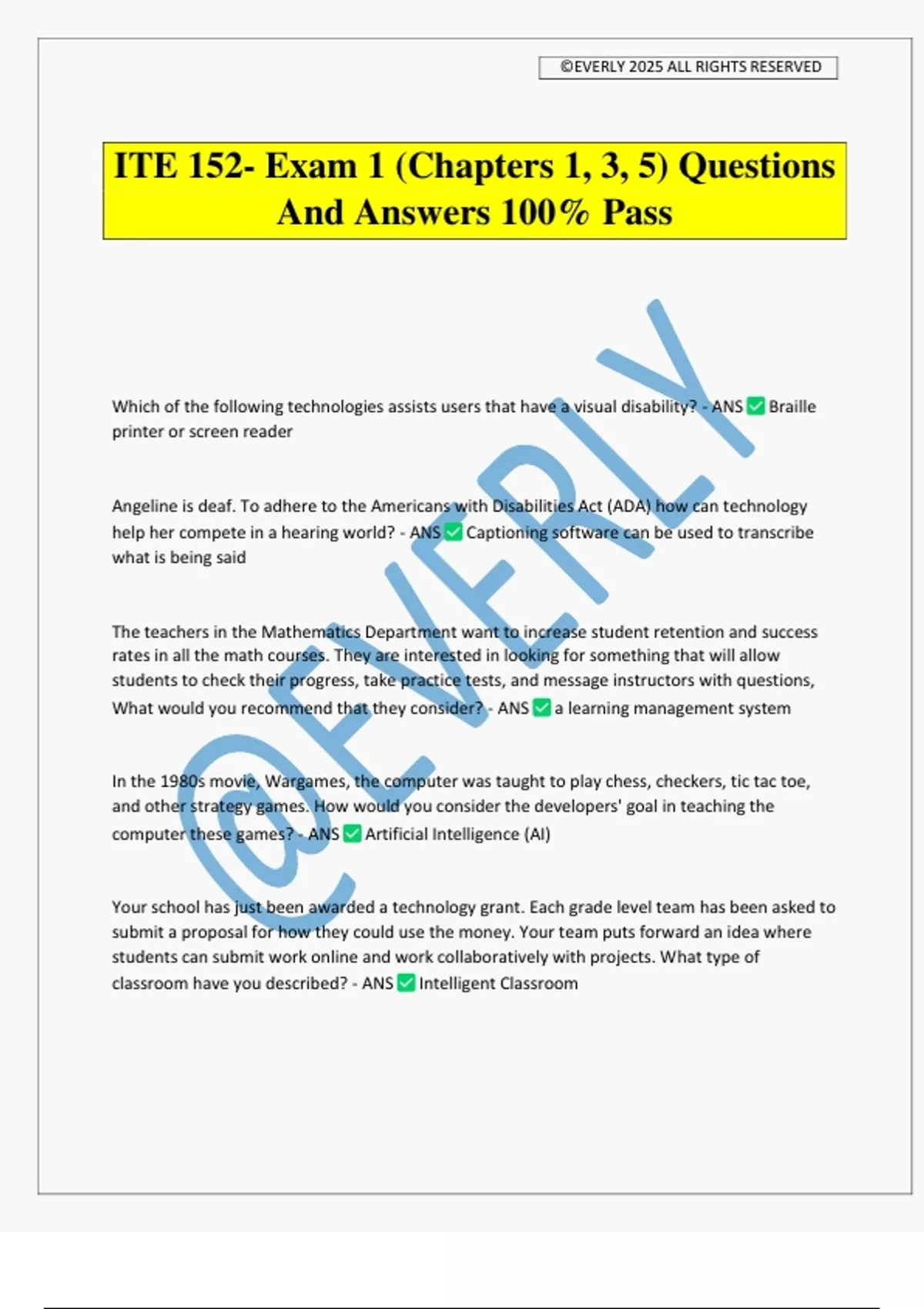 ITE 152- Exam 1 (Chapters 1, 3, 5) Questions And Answers 100% Pass Which of the following technologies assists users that have a visual disability? - ANS Braille printer or screen reader Angeline is deaf. To adhere to the Americans with Disabilities Act (ADA) how can technology help her compete in a hearing world? - ANS Captioning software can be used to transcribe what is being said The teachers in the Mathematics Department want to increase student retention and success rates in all the math courses. They are interested in looking for something that will allow students to check their progress, take practice tests, and message instructors with questions, What would you recommend that they consider? - ANS a learning management system In the 1980s movie, Wargames, the computer was taught to play chess, checkers, tic tac toe, and other strategy games. How would you consider the developers' goal in teaching the computer these games? - ANS Artificial Intelligence (AI) Your school has just been awarded a technology grant. Each grade level team has been asked to submit a proposal for how they could use the money. Your team puts forward an idea where students can submit work online and work collaboratively with projects. What type of classroom have you described? - ANS Intelligent Classroom ©EVERLY 2025 ALL RIGHTS RESERVED An intelligent workplace uses technology to enable workers to connect to the company's network, communicate with each other, use productivity software and apps, and meet via web conferencing (T/F) - ANS True Which technology device could be used to view a patient's internal organs? - ANS Ingestible Camera How will technology help people with disabilities become more transportation independent? - ANS Automated vehicles will be developed The fifth grade class at the local elementary school is doing a class project on recycling and wants to involve the entire community. How could they inform the community members about their project using social networking? - ANS They could create a hashtag or post on social media Akira has a mobility impairment that makes it difficult to type on a keyboard. What technology can she use to create written documents without using a keyboard? - ANS Speech recognition software Emma tried to explain to her mother that computers are everywhere, Her mother does not believe her, and challenges Emma to find a computer in their home, as she knows she does not own a computer. Which of the following examples do you think Emma would show her mother as an example of a computer? - ANS Her coffeemaker that she has set to turn on and make coffee every morning at the same time Before going into space, astronauts spend many hours training on flight simulators allowing them to learn how to fly without life and death consequences. How would you describe the technology the flight simulator is using? - ANS Virtual Reality (VR) Margot and Thomas have heard how beautiful the Swiss Alps are, but they are afraid to fly. What technology could they use to see and experience the Alps without flying there? - ANS Virtual Reality