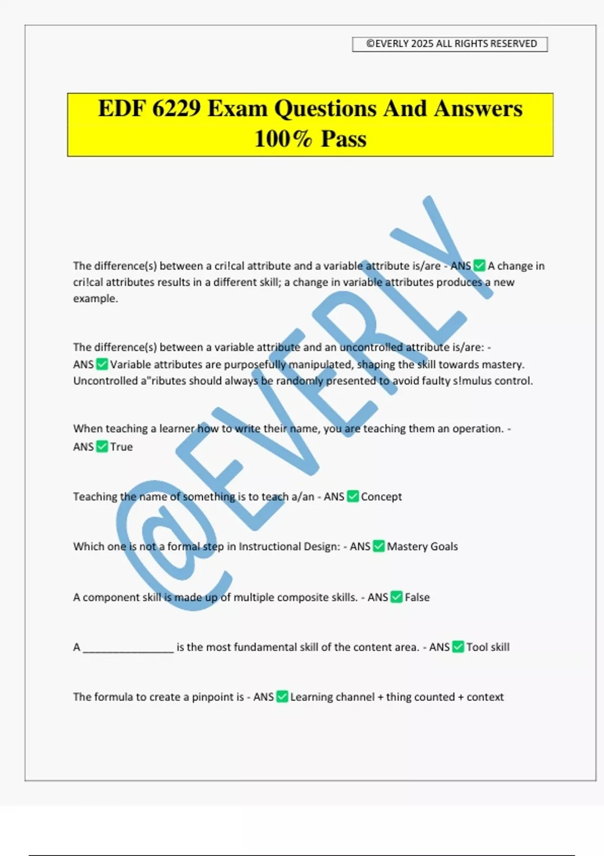 EDF 6229 Exam Questions And Answers 100% Pass The difference(s) between a cri!cal attribute and a variable attribute is/are - ANS A change in cri!cal attributes results in a different skill; a change in variable attributes produces a new example. The difference(s) between a variable attribute and an uncontrolled attribute is/are: - ANS Variable attributes are purposefully manipulated, shaping the skill towards mastery. Uncontrolled a"ributes should always be randomly presented to avoid faulty s!mulus control. When teaching a learner how to write their name, you are teaching them an operation. - ANS True Teaching the name of something is to teach a/an - ANS Concept Which one is not a formal step in Instructional Design: - ANS Mastery Goals A component skill is made up of multiple composite skills. - ANS False A _______________ is the most fundamental skill of the content area. - ANS Tool skill The formula to create a pinp