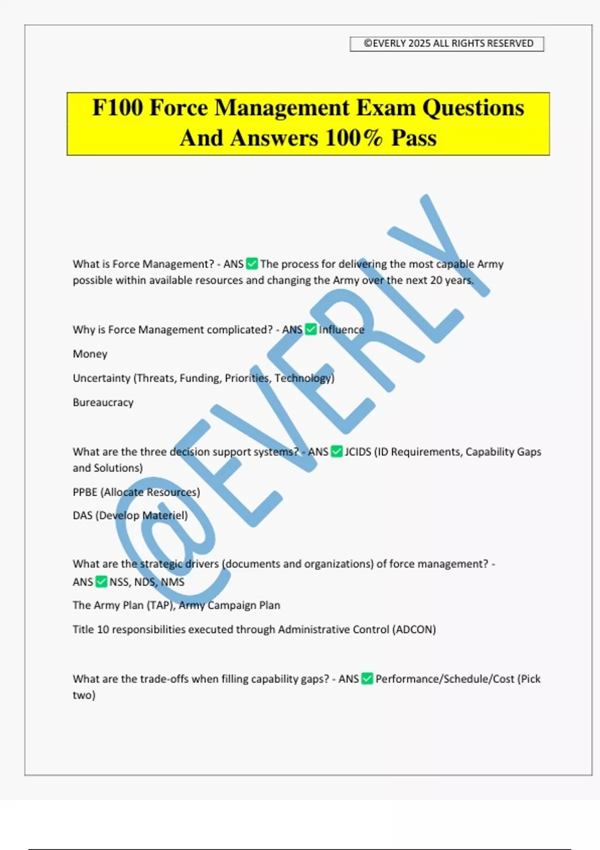 F100 Force Management Exam Questions And Answers 100% Pass What is Force Management? - ANS The process for delivering the most capable Army possible within available resources and changing the Army over the next 20 years. Why is Force Management complicated? - ANS Influence Money Uncertainty (Threats, Funding, Priorities, Technology) Bureaucracy What are the three decision support systems? - ANS JCIDS (ID Requirements, Capability Gaps and Solutions) PPBE (Allocate Resources) DAS (Develop Materiel) What are the strategic drivers (documents and organizations) of force management? - ANS NSS, NDS, NMS The Army Plan (TAP), Army Campaign Plan Title 10 responsibilities executed through Administrative Control (ADCON) What are the trade-offs when filling capability gaps? - ANS Performance/Schedule/Cost (Pick two) ©EVERLY 2025 ALL RIGHTS RESERVED What is DOTMLPF-P? - ANS Problem solving construct for assessing current and future capabilities. Ways to solve capability gaps. (Doctrine, Organization, Training, Materiel, Leadership & Education, Personnel, Facilities, Policy) What does JCIDS do for the Joint Force? - ANS Capabilities-based approach to identify current and future capability gaps in the joint force ability to carry out joint warfighting missions and functions. What are the three phases of Capabilities Based Assessment (CBA)? - ANS Functional Area Assessment (FAA) Functional Needs Assessment (FNA) Functional Solutions Assessment (FSA) Which organizations are key to the JCIDS Process? - ANS Centers of Excellence-Cross Functional Teams (Determines Requirements) Army Futures Command (Leads Requirements Determinations) JROC and AROC (Validates Requirements) What do the three 'requirements lanes' (urgent, emergent, deliberate) do for our Army? - ANS Allows the JCIDS process the flexibility to react to urgent, time sensitive commander's capability gaps. (Examples: JUONS, ONS) Why are there Milestone Decisions in material development and what happens after each of them? - ANS Milestone A: The technology is viable and it will fill the gap within reasonable costs. Moves to Technology Maturation & Risk Reduction Milestone B: Companies can make it, it can be sustained, we have a plan for testing and we know how many prototypes to make. Moves to Engineering & Manufacturing Development Milestone C: Companies will make it, initial testing is positive, we know how many to make, contracts in place to make
