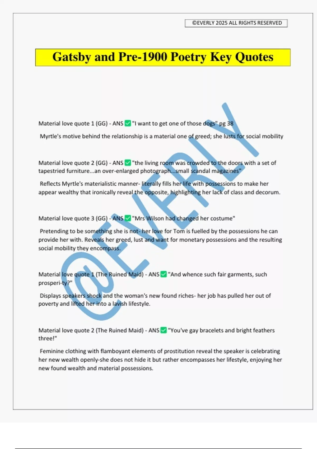Gatsby and Pre-1900 Poetry Key Quotes Material love quote 1 (GG) - ANS "I want to get one of those dogs" pg 38 Myrtle's motive behind the relationship is a material one of greed; she lusts for social mobility Material love quote 2 (GG) - ANS "the living room was crowded to the doors with a set of tapestried furniture...an over-enlarged photograph...small scandal magazines" Reflects Myrtle's materialistic manner- literally fills her life with possessions to make her appear wealthy that ironically reveal the opposite, highlighting her lack of class and decorum. Material love quote 3 (GG) - ANS "Mrs Wilson had changed her costume" Pretending to be something she is not- her love for Tom is fuelled by the possessions he can provide her with. Reveals her greed, lust and want for monetary possessions and the resulting social mobility they encompass. Material love quote 1 (The Ruined Maid) - ANS "And whence such fair garments, such prosperi-ty?" Displays speakers shock and the woman's new found riches- her job has pulled her out of poverty and lifted her into a lavish lifestyle. Material love quote 2 (The Ruined Maid) - ANS "You've gay bracelets and bright feathers three!" Feminine clothing with flamboyant elements of prostitution reveal the speaker is celebrating her new wealth openly-she does not hide it but rather encompasses her lifestyle, enjoying her new found wealth and material possessions. ©EVERLY 2025 ALL RIGHTS RESERVED Material love quote 3 (The Ruined Maid) - ANS "Some polish is gained with one's ruin" The speaker's accent no longer mirrors those in poverty- she has changed to fit in Her more eloquent language displays her new found sophistication and wealth and also raises the issue of what social etiquette actually means- she has arguably gained social mobility due to something seen as morally destructive by society. Material love quote 1 (Who so list to hount I knowe where is an hynde) - ANS "diamondes in letters plain" Creates the image of a collar, again reducing the woman to an animal, seen as a possession, reinforcing the patriarchy and class system of the 16th century. Material love quote 2 (Who so list to hount I knowe where is an hynde) - ANS "faier neck" Begins to focus of the appearance of the woman and her beauty, again reducing the woman to a glamorous possession of the king, something to be shown off. Material love quote 3 (Who so list to hount I knowe where is an hynde) - ANS "~Noli me tangere for Cesars I ame" "Don't touch me"- as a material possession of the king she cannot be seen to shift towards anyone else. The woman is used by the king as a possession, to gloat at capturing a beautiful woman. There is no love between the two as long as the unequal power dynamic remains in place. Idealized love quote 1 (GG) - ANS The colours of precious metals increase in value throughout the novel. Nick describes Daisy as a "golden girl" - she is a radiant character with a "glowing" voice and face. Her "golden" image is also associated with money- Gatsby comments that Daisy's "glowing voice is "full of money". Nick suggests that the young Gatsby saw Daisy as "silver" whereas over time she becomes "golden". The increasing value of the metallic metaphors show how unattainable she has become to Gatsby- she embodies all he wishes to have. ©EVERLY 2025 ALL RIGHTS RESERVED Idealized love quote 2 (GG) - ANS 'Stretched out his arms...trembling...green light' ' Gatsby believed in the green light, the orgastic future that year by year recedes before us'- Context: The concluding sentences of the book when Nick is reminiscing about Gatsby and what Gatsby believed in. Reinforces significant theme of lust- throughout the novel, Gatsby is constantly thinking about the theme that a lot of the characters in the book chase as well which is pursuing the visions of the future, which are determined by the past, which is evident in how Gatsby plans his encounters with Daisy. Gives insight on Gatsby's internal struggle throughout the book as well as the struggle of the attaining of the American dream itself, as they "running faster, and stretching further" to attain something that moves further away. Furthermore, Nick says that "we beat on, boats against the current, borne back ceaselessly into the past" suggesting that as we struggle to attain something in the future we are getting nowhere as the something is constantly dragging us behind. Idealised love quote 3 (GG) - ANS 'He literally glowed' 'he hadn't once ceased looking at Daisy'- It is not his silver shirt or gold tie that are bright now, but Gatsby himself. His inner fear is resolved for the moment as the fulfillment of his dream seems to promise. Contrast this with how Nick describes Gatsby at the beginning of this day: "He was pale, and there were dark signs of sleeplessness beneath his eyes." Idealized love quote 1 (Sonnet 116) - ANS "ever fixed marke" The nautical metaphor compares love to a star that acts as a steady beacon of hope. Sailors used to rely on stars as a form of navigation, and Shakespeare uses this method to compare how equally, without love, it is impossible to navigate throughout life. Love acts as the "ever fixed marke", constantly guiding lovers through life's hardships. Idealized love quote 2 (Sonnet 116) - ANS "Lov's not Times foole" Personifies love and time- although a person's appearance will change over time their soul will remain the same. Love is everlasting and survives both time and death. Idealized love quote 3 (Sonnet 116) - ANS "Love alters not...but beares it out even to the edge of doome" Shakespeare sugges