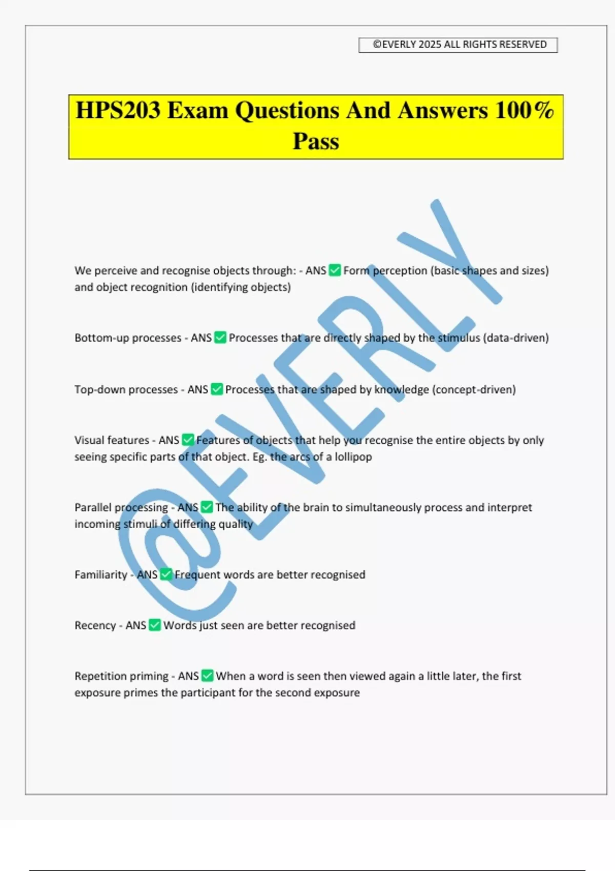HPS203 Exam Questions And Answers 100% Pass We perceive and recognise objects through: - ANS Form perception (basic shapes and sizes) and object recognition (identifying objects) Bottom-up processes - ANS Processes that are directly shaped by the stimulus (data-driven) Top-down processes - ANS Processes that are shaped by knowledge (concept-driven) Visual features - ANS Features of objects that help you recognise the entire objects by only seeing specific parts of that object. Eg. the arcs of a lollipop Parallel processing - ANS The ability of the brain to simultaneously process and interpret incoming stimuli of differing quality Familiarity - ANS Frequent words are better recognised Recency - ANS Words just seen are better recognised Repetition priming - ANS When a word is seen then viewed again a little later, the first exposure primes the participant for the second exposure ©EVERLY 2025 ALL RIGHTS RESERVED Feature nets - ANS A network of detectors, organised in layers, with each subsequent layer having more complex, larger scale objects - allows for more efficient memory storage however at the cost of occasional error Feature detectors - ANS When we recognise shapes of letters Bigram detectors - ANS When we recognise familiar letter combinations (CL, CK) in comparison to unfamiliar ones (CQ, CX) - requires less activation levels Activation level - ANS how mental arousal is necessary for effective functioning in that we need a certain level of activation in order to be sufficiently motivated to achieve goals, do good work and so on. Response threshold - ANS When an activation level reaches the detector's response threshold, the detector will fire - it sends its signal to the other detectors to which it's connected to McCelland and Rumelhart Model - ANS Rather than believing that the activation of detectors serve to activate other detectors, it is believed that detectors inhibit one another, so that activation of one detector can decrease the activation in other detectors Excitatory connections - ANS Connections that allow one detector to activate its neighbours Inhibitory connections - ANS When detectors deactivate its neighbours Biederman's recognition-by-components theory - ANS According to this theory we are able to recognise objects by separating them into geons (the object's main component parts) Geons - ANS Simple components and shapes - cylinders, cones, blocks - are recognised across different orientations and view
