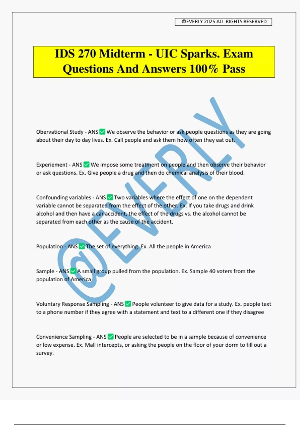 IDS 270 Midterm - UIC Sparks. Exam Questions And Answers 100% Pass Obervational Study - ANS We observe the behavior or ask people questions as they are going about their day to day lives. Ex. Call people and ask them how often they eat out. Experiement - ANS We impose some treatment on people and then observe their behavior or ask questions. Ex. Give people a drug and then do chemical analysis of their blood. Confounding variables - ANS Two variables where the effect of one on the dependent variable cannot be separated from the effect of the other. Ex. If you take drugs and drink alcohol and then have a car accident, the effect of the drugs vs. the alcohol cannot be separated from each other as the cause of the accident. Population - ANS The set of everything. Ex. All the people in America Sample - ANS A small group pulled from the population. Ex. Sample 40 voters from the population of America Voluntary Response Sampling - ANS People volunteer to give data for a study. Ex. people text to a phone number if they agree with a statement and text to a different one if they disagree Convenience Sampling - ANS People are selected to be in a sample because of convenience or low expense. Ex. Mall intercepts, or asking the people on the floor of your dorm to fill out a survey.