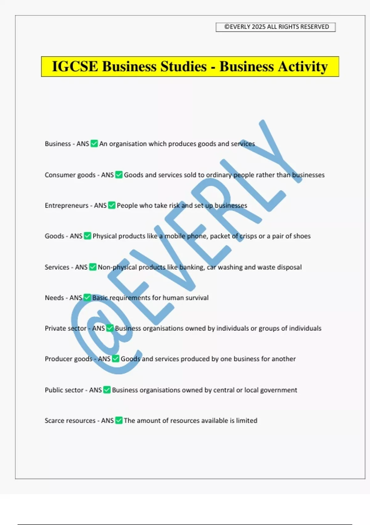 IGCSE Business Studies - Business Activity Business - ANS An organisation which produces goods and services Consumer goods - ANS Goods and services sold to ordinary people rather than businesses Entrepreneurs - ANS People who take risk and set up businesses Goods - ANS Physical products like a mobile phone, packet of crisps or a pair of shoes Services - ANS Non-physical products like banking, car washing and waste disposal Needs - ANS Basic requirements for human survival Private sector - ANS Business organisations owned by individuals or groups of individuals Producer goods - ANS Goods and services produced by one business for another Public sector - ANS Business organisations owned by central or local government Scarce resources - ANS The amount of resources available is limited