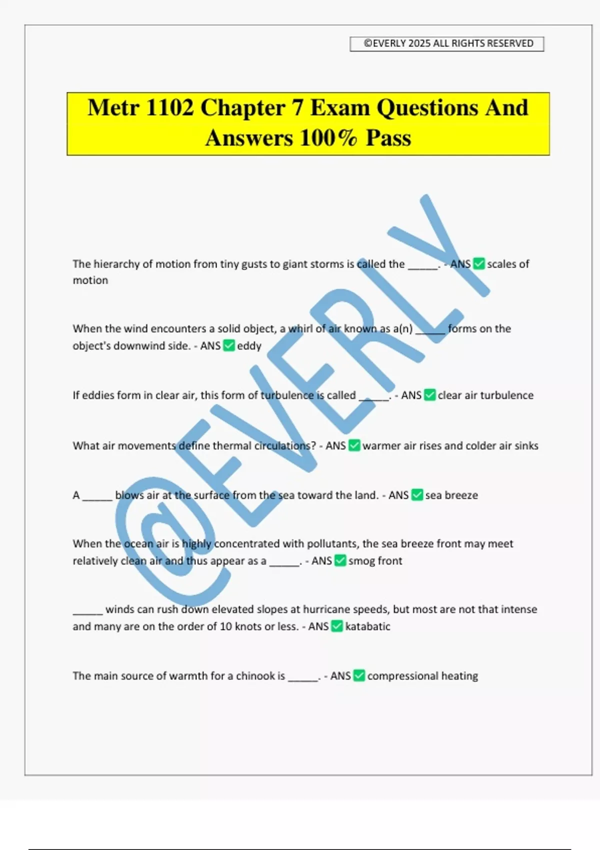 Metr 1102 Chapter 7 Exam Questions And Answers 100% Pass The hierarchy of motion from tiny gusts to giant storms is called the _____. - ANS scales of motion When the wind encounters a solid object, a whirl of air known as a(n) _____ forms on the object's downwind side. - ANS eddy If eddies form in clear air, this form of turbulence is called _____. - ANS clear air turbulence What air movements define thermal circulations? - ANS warmer air rises and colder air sinks A _____ blows air at the surface from the sea toward the land. - ANS sea breeze When the ocean air is highly concentrated with pollutants, the sea breeze front may meet relatively clean air and thus appear as a _____. - ANS smog front _____ winds can rush down elevated slopes at hurricane speeds, but most are not that intense and many are on the order of 1
