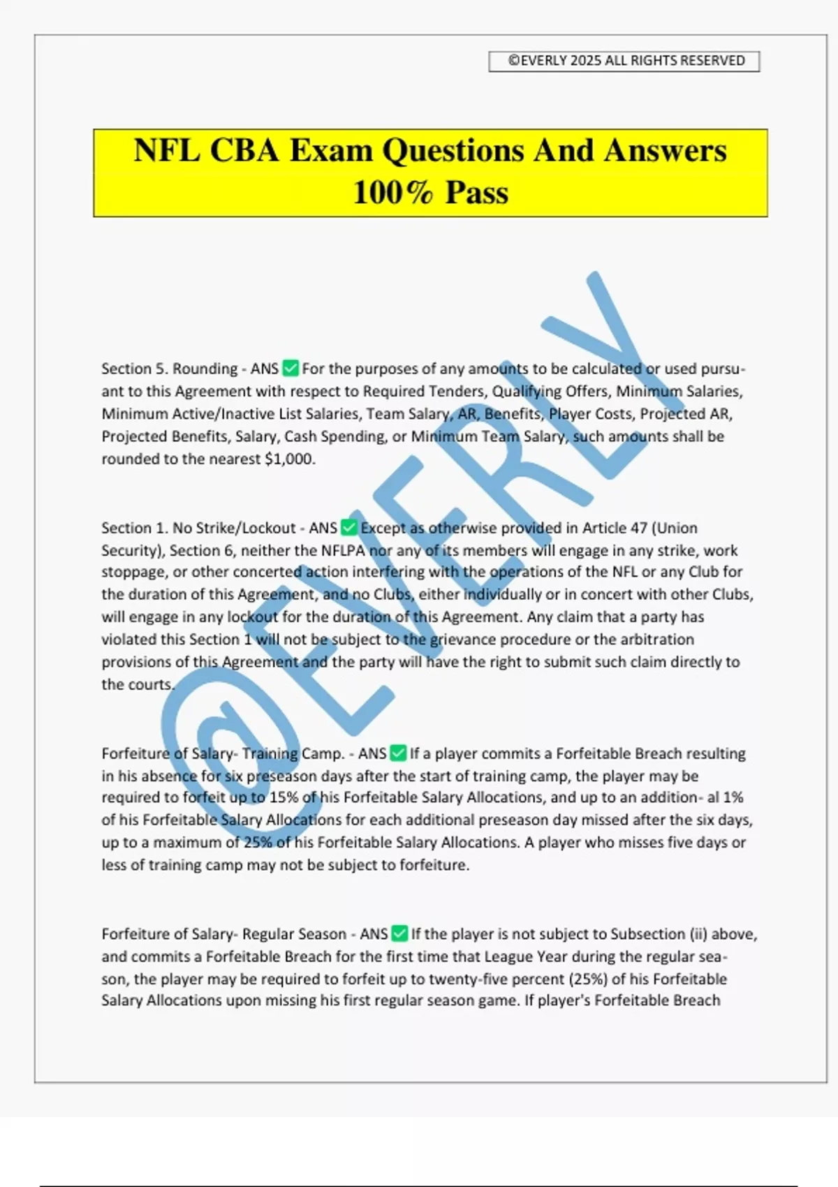 NFL CBA Exam Questions And Answers 100% Pass Section 5. Rounding - ANS For the purposes of any amounts to be calculated or used pursu- ant to this Agreement with respect to Required Tenders, Qualifying Offers, Minimum Salaries, Minimum Active/Inactive List Salaries, Team Salary, AR, Benefits, Player Costs, Projected AR, Projected Benefits, Salary, Cash Spending, or Minimum Team Salary, such amounts shall be rounded to the nearest $1,000. Section 1. No Strike/Lockout - ANS Except as otherwise provided in Article 47 (Union Security), Section 6, neither the NFLPA nor any of its members will engage in any strike, work stoppage, or other concerted action interfering with the operations of the NFL or any Club for the duration of this Agreement, and no Clubs, either individually or in concert with other Clubs, will engage in any lockout for the duration of this Agreement. Any claim that a party has violated this Section 1 will not be subject to the grievance procedure or the arbitration provisions of this Agreement and the party will have the right to submit such claim directly to the courts. Forfeiture of Salary- Training Camp. - ANS If a player commits a Forfeitable Breach resulting in his absence for six preseason days after the start of training camp, the player may be required to forfeit up to 15% of his Forfeitable Salary Allocations, and up to an addition- al 1% of his Forfeitable Salary Allocations for each additional preseason day missed after the six days, up to a maximum of 25% of his Forfeitable Salary Allocations. A player who misses five days or less of training camp may not be subject to forfeiture. Forfeiture of Salary- Regular Season - ANS If the player is not subject to Subsection (ii) above, and commits a Forfeitable Breach for the first time that League Year during the regular sea- son, the player may be required to forfeit up to twenty-five percent (25%) of his Forfeitable Salary Allocations upon missing his first regular season game. If player's Forfeitable Breach ©EVERLY 2025 ALL RIGHTS RESERVED continues beyond four (4) consecutive weeks, then player may be required to forfeit up to his remaining Forfeitable Salary Allocations on a proportionate weekly basis (i.e., one-seventeenth for each missed regular season week after the fourth week). Forfeiture of Salary- Postseason. - ANS For the period following the Club's last regular season game through the Club's last postseason game, a player who commits a Forfeitable Breach during such period may be required to forfeit up to 25% of his Forfeitable Salary Alloca- tions for that League Year, subject to Subsection (d) below. College Draft- Number of Choices and Eligibility (a) - ANS The Draft shall consist of seven rounds, with each round consisting of the same number of selection choices as there will be Clubs in the NFL the following League Year, plus a maximum number of additional Compensatory Draft Selections equal to the number of Clubs then in the League, with such Compensatory Draft Selections reserved for Clubs losing certain Unrestricted Free Agents. Each Draft shall be held between February 14 and June 2, on a date which shall be determined by the Commissioner. College Draft- Number of Choices and Eligibility (b) - ANS No player shall be permitted to apply for special eligibility for selection in the Draft, or otherwise be eligible for the Draft, until three NFL regular seasons have begun and ended following either his graduation from high school or graduation of the class with which he entered high school, whichever is earlier. For example, if a player graduated from high school in December 2011, he would not be permitted to apply for special eligibility, and would not otherwise be eligible for selection, until the 2015 Draft. College Draft- Number of Choices and Eligibility (c) - ANS If a player who was not eligible for the Draft in any League Year be- comes eligible after the date of the Draft, he will be eligible to be selected in a Supplemental Draft, if the League elects to conduct such a Draft, on or before the sev- enth calendar day prior to the opening of the first training camp that League Year. No player may elect to bypass a Draft for which he is eligible to apply for selection in a Supplemental Draft. Any Club that selects a player in a Supplemental Draft must forfeit a choice in the same round in the next succeeding principal Draft.