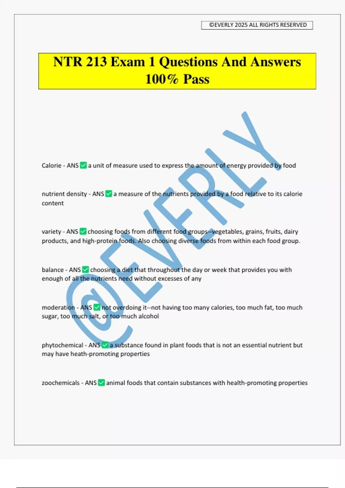 NTR 213 Exam 1 Questions And Answers 100% Pass Calorie - ANS a unit of measure used to express the amount of energy provided by food nutrient density - ANS a measure of the nutrients provided by a food relative to its calorie content variety - ANS choosing foods from different food groups--vegetables, grains, fruits, dairy products, and high-protein foods. Also choosing diverse foods from within each food group. balance - ANS choosing a diet that throughout the day or week that provides you with enough of all the nutrients need without excesses of any moderation - ANS not overdoing it--not having too many calories, too much fat, too much sugar, too much salt, or too much alcohol phytochemical - ANS a substance found in plant foods that is not an essential nutrient but may have heath-promoting properties zoochemicals - ANS animal foods that contain substances with health-promoting properties ©EVERLY 2025 ALL RIGHTS RESERVED essential nutrient v non-essential nutrient - ANS + our bodies cannot make them, so it is essential that we consume them - our bodies can make them from other nutrients, so it is not essential that we consume them classes of nutrient - ANS nutrients macronutrients micronutrients carbs proteins lipids water vitamins minerals which nutrients contain calories? - ANS macronutrients what are the six steps of the scientific method? - ANS 1. make an observation 2. propose a hypothesis 3. design and conduct an experiment 4. analyze results 5. peer review 6. develop theory 3 types of research studies - ANS 1. epidemiological 2. laboratory 3. experimental or clinical questions to evaluate nutrition info - ANS -does it seem too good to be true? -who is providing the info? do they have something to gain? who performed the study? -are there other studies to support this info? questions to evaluate online nutrition info - ANS -who runs or pays for the site? -what is the purpos