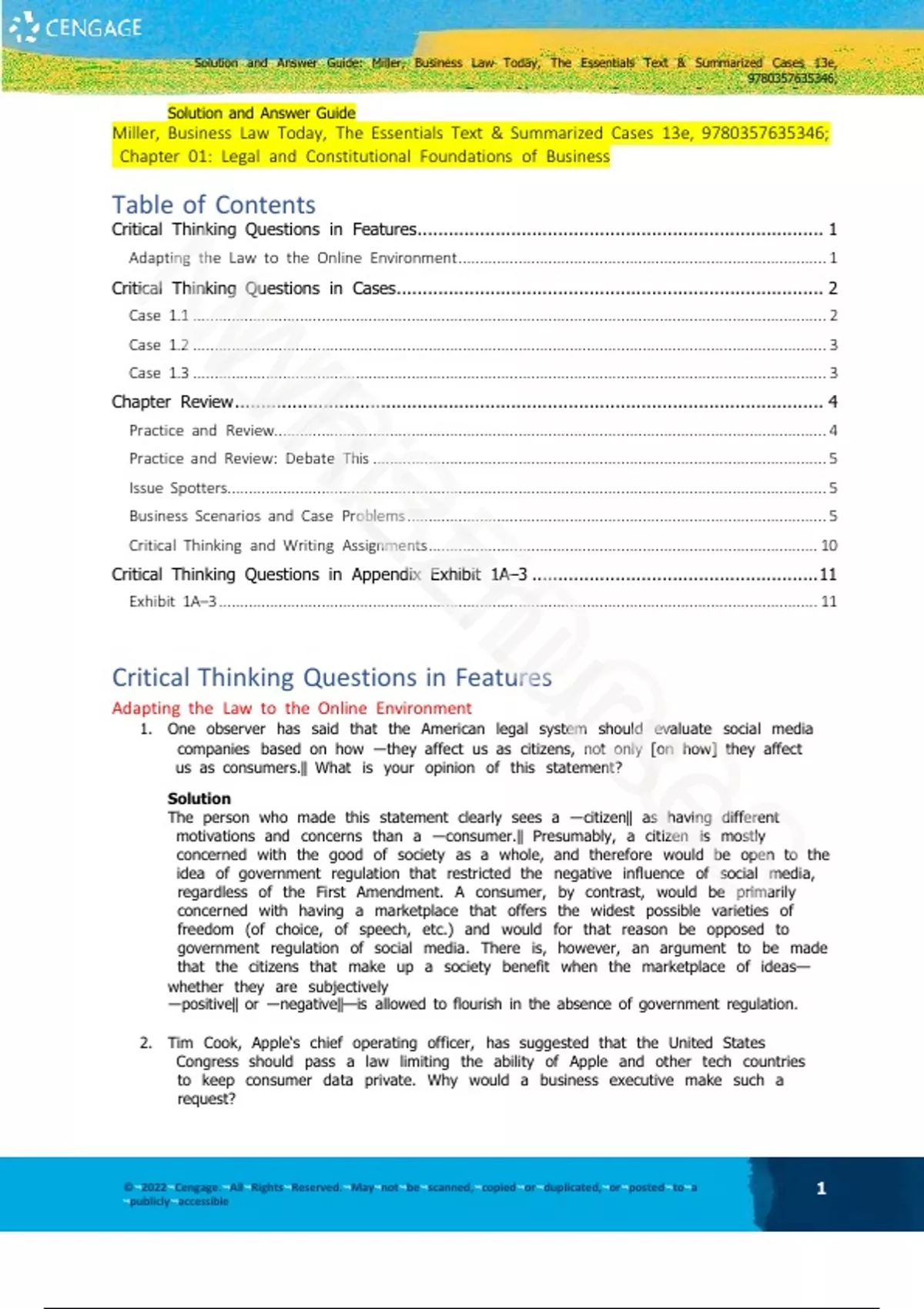 Solution and Answer Guide: Miller, Business Law Today, The Essentials Text & Summarized Cases 13e,