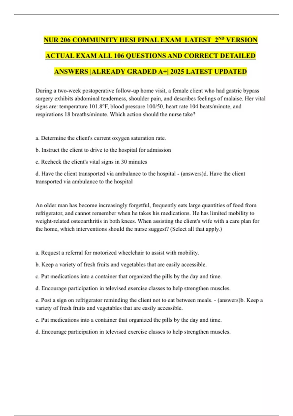 d. Have the client transported via ambulance to the hospital - (answers)d. Have the client