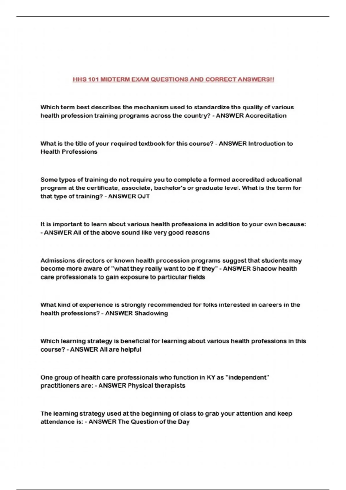 HHS 101 MIDTERM EXAM QUESTIONS AND CORRECT ANSWERS!!...