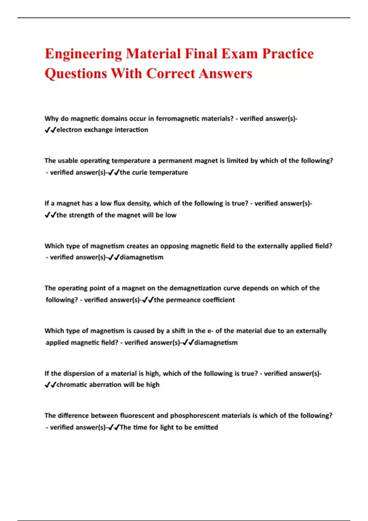 Engineering Material Final Exam Practice Questions With Correct Answers