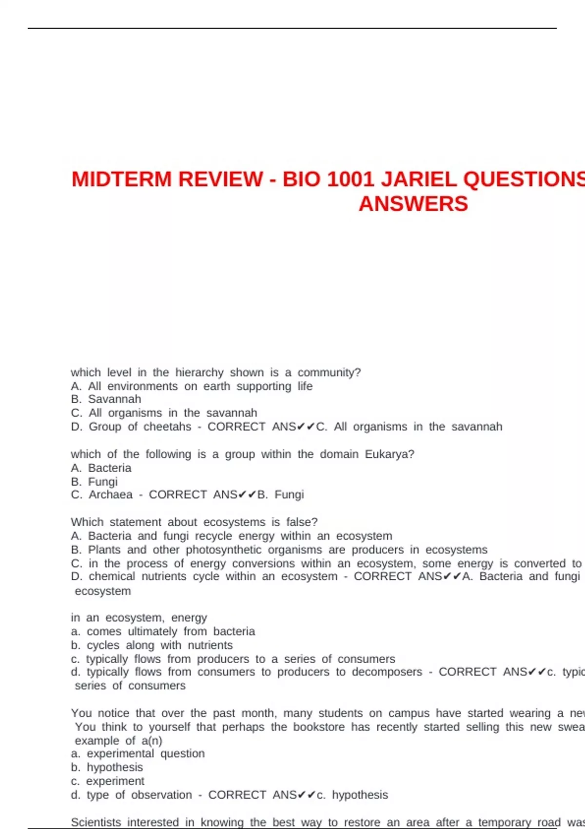 MIDTERM REVIEW - BIO 1001 JARIEL QUESTIONS AND CORRECT ANSWERS