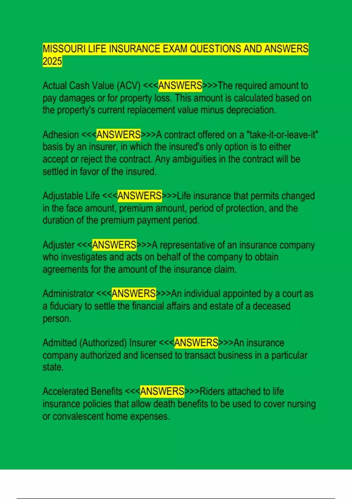 MISSOURI LIFE INSURANCE EXAM QUESTIONS AND ANSWERS 2025