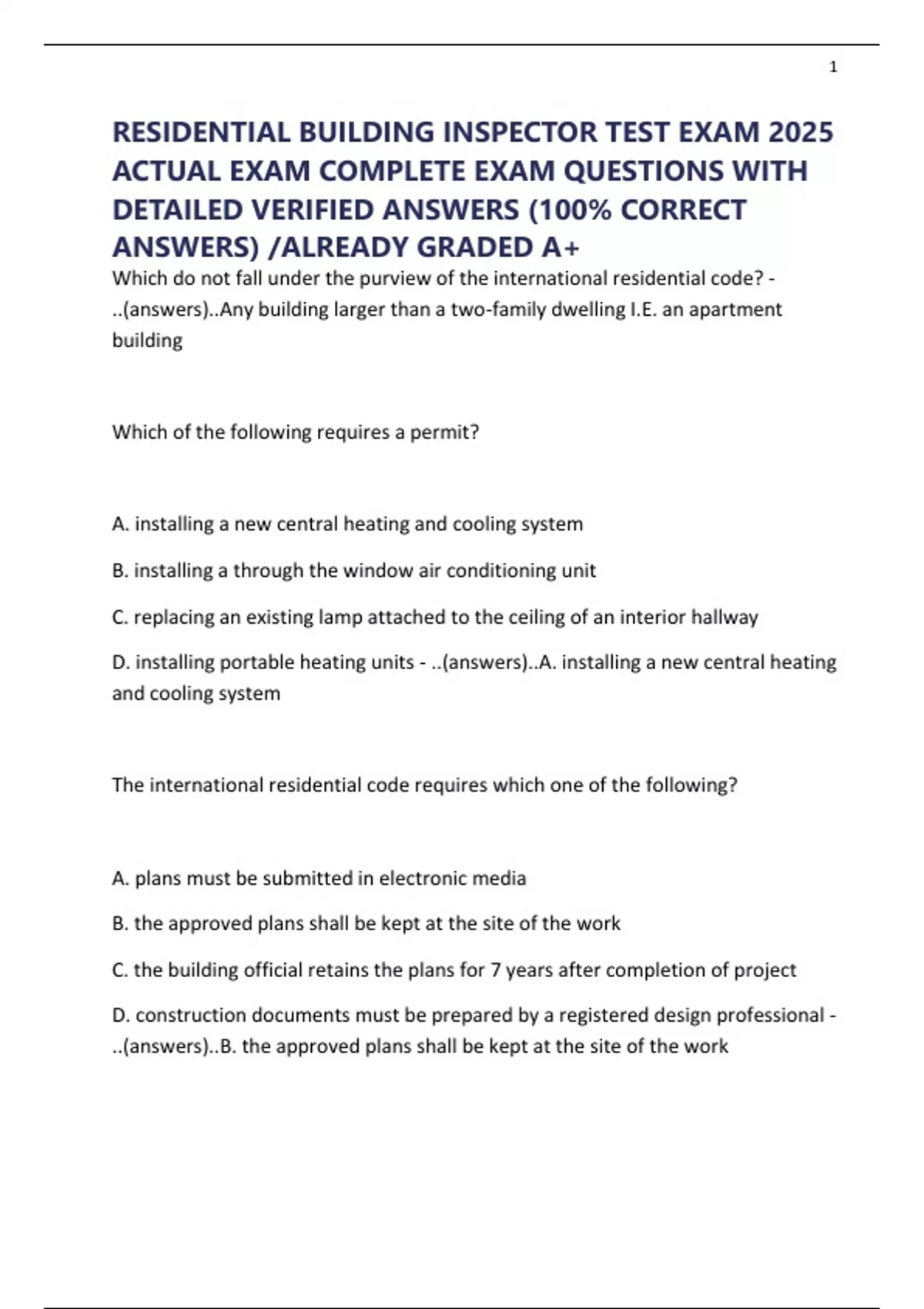 RESIDENTIAL BUILDING INSPECTOR TEST EXAM 2025 ACTUAL EXAM COMPLETE EXAM QUESTIONS WITH DETAILED VERIFIED ANSWERS (100% CORRECT ANSWERS) /ALREADY GRADED A+