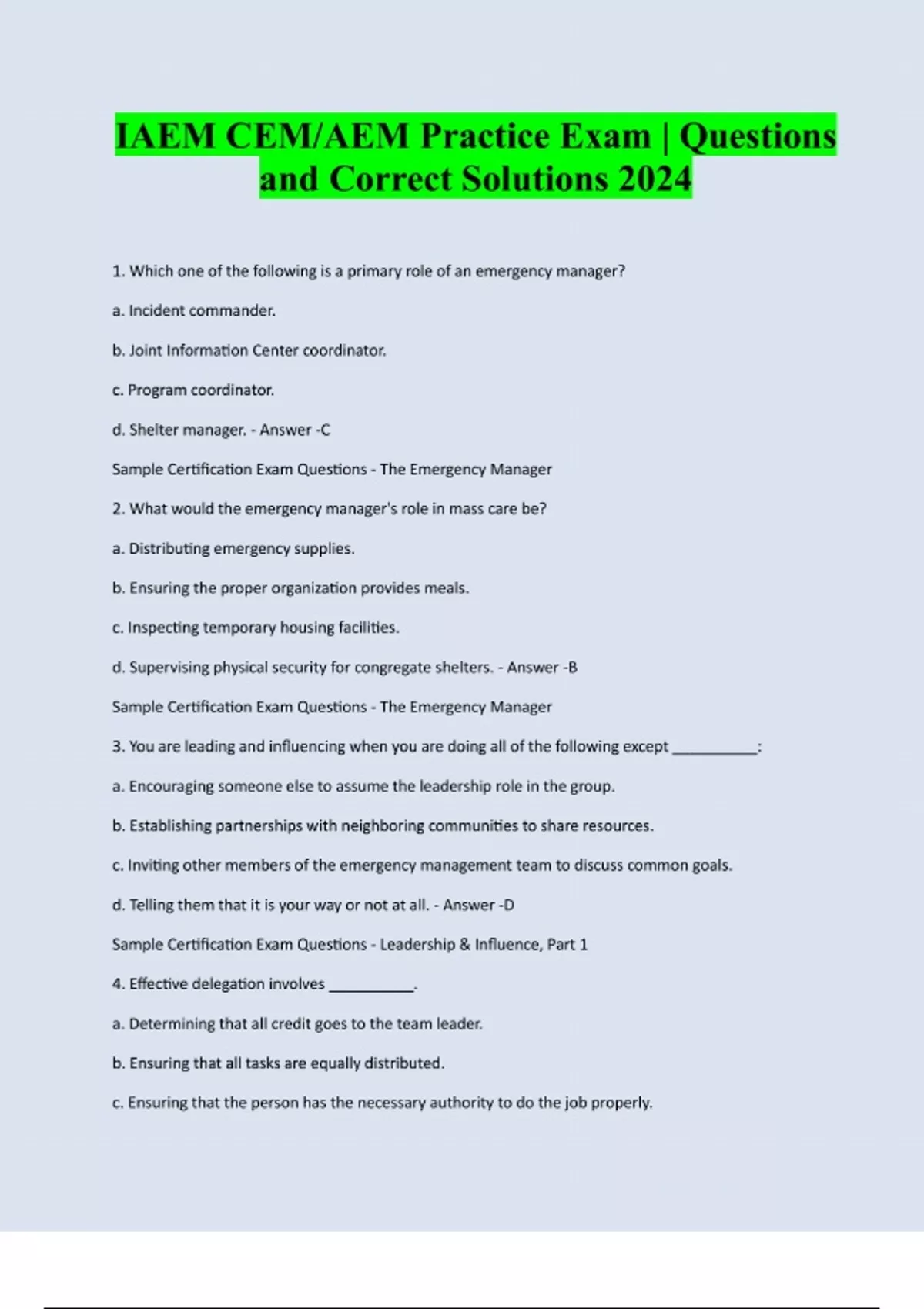 1. Which one of the following is a primary role of an emergency manager? a. Incident commander. b. Joint Information Center coordinator. c. Program coordinator. d. Shelter manager. - Answer -C Sample Certification Exam Questions - The Emergency Manager 2. What would the emergency manager's role in mass care be? a. Distributing emergency supplies. b. Ensuring the proper organization provides meals. c. Inspecting temporary housing facilities. d. Supervising physical security for congregate shelters. - Answer -B Sample Certification Exam Questions - The Emergency Manager 3. You are leading and influencing when you are doing all of the following except __________: a. Encouraging someone else to assume the leadership role in the group. b. Establishing partnerships with neighboring communities to share resources. c. Inviting other members of the emergency management team to discuss common goals. d. Telling them that it is your way or not at all. - Answer -D Sample Certification Exam Questions - Leadership & Influence, Part 1 4. Effective delegation involves __________. a. Determining that all credit goes to the team leader. b. Ensuring that all tasks are equally distributed. c. Ensuring that the person has the necessary authority to do the job properly.d. Guaranteeing all employees have a chance to do the same task. - Answer -C Sample Certification Exam Questions - Leadership & Influence, Part 1 5. What should a leader do when setting up implementation structures to facilitate change? a. Focus on interim systems because there will be time later to deal with long-term impact. b. Consider primarily long-term impacts because the short-term will take care of itself. c. Include representatives of all key stakeholder groups. d. Place the greatest emphasis on how the change will impact the highest levels of management. - Answer -C Sample Certification Exam Questions - Leadership & Influence, Part 2 6. During times of change, it is important for leaders to ____________: a. Make sure that they put the right spin on the situation, especially when things are going badly. b. Discourage stakeholders from expressing their misgivings. c. Explain the situation once, then move on - don't dwell on it. d. Communicate first through actions, then words. - Answer -D Sample Certification Exam Questions - Leadership & Influence, Part 2 7. Airing your concerns about taking on a new commitment is likely to: a. Build trust. b. Erode trust. c. Expand your capacity to trust. d. Reduce your responsibility but enhance your authority. - Answer -A Sample Certification Exam Questions - Leadership & Influence, Part 3 8. Demonstrating conviction, courage, compassion, and community can: a. Be used by a transformational leader to build trust. b. Diminish your capacity for trusting others. c. Make you vulnerable to your adversaries. d. Undermine or erode trust. - Answer -ASample Certification Exam Questions - Leadership & Influence, Part 3